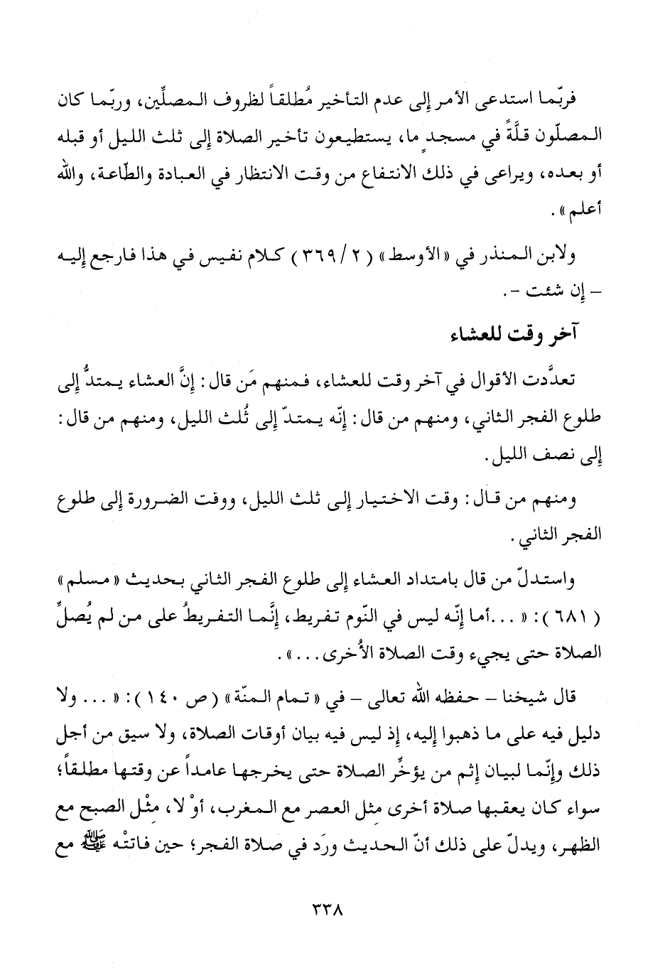 فربّما استدعى الأمر إِلى عدم التأخير مُطلقاً لظروف المصلِّين، وربما كان المصلّون قلَّةً في مسجدٍ ما، يستطيعون تأخير الصلاة إِلى ثلث الليل أو قبله أو بعده، ويراعى في ذلك الانتفاع من وقت الانتظار في العبادة والطاعة، والله أعلم".