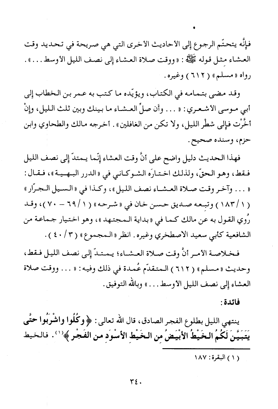 وقد مضى بتمامه في الكتاب، ويؤيّده ما كتب به عمر بن الخطاب إِلى أبي موسى الأشعري: " ... وأَن صلِّ العشاء ما بينك وبين ثلث الليل، وإنْ أخَّرْت فإِلى شطْر الليل، ولا تكن من الغافلين". أخرجه مالك والطحاوي وابن حزم، وسنده صحيح.