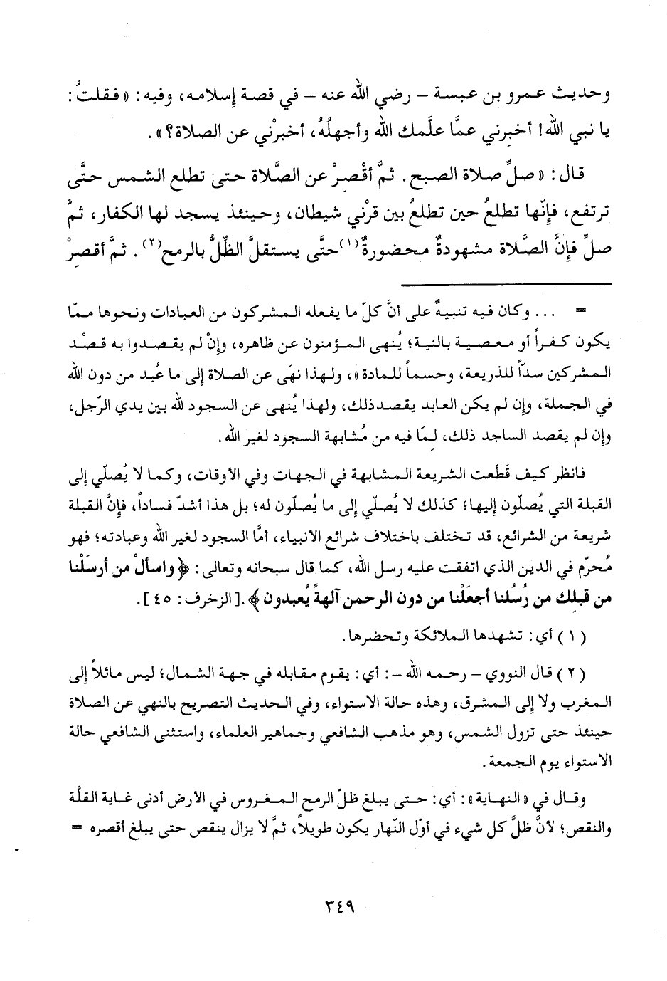 فانظر كيف قَطَعت الشريعة المشابهة في الجهات وفي الأوقات، وكما لا يُصلّي إِلى القبلة التي يُصلون إِليها؛ كذلك لا يصلّي إِلى ما يُصلّون له؛ بل هذا أشدّ فساداً، فإِنَّ القبلة شريعة من الشرائع، قد تختلف باختلاف شرائع الأنبياء، أمَّا السجود لغير الله وعبادته؛ فهو مًحرّم في الدين الذي اتفقت عليه رسل الله، كما قال سبحانه وتعالى: {واسألْ من أرسَلْنا من قبلِك من رُسُلنا أجعَلْنا من دون الرحمن آلهةً يُعبدون}. [الزخرف: 45].