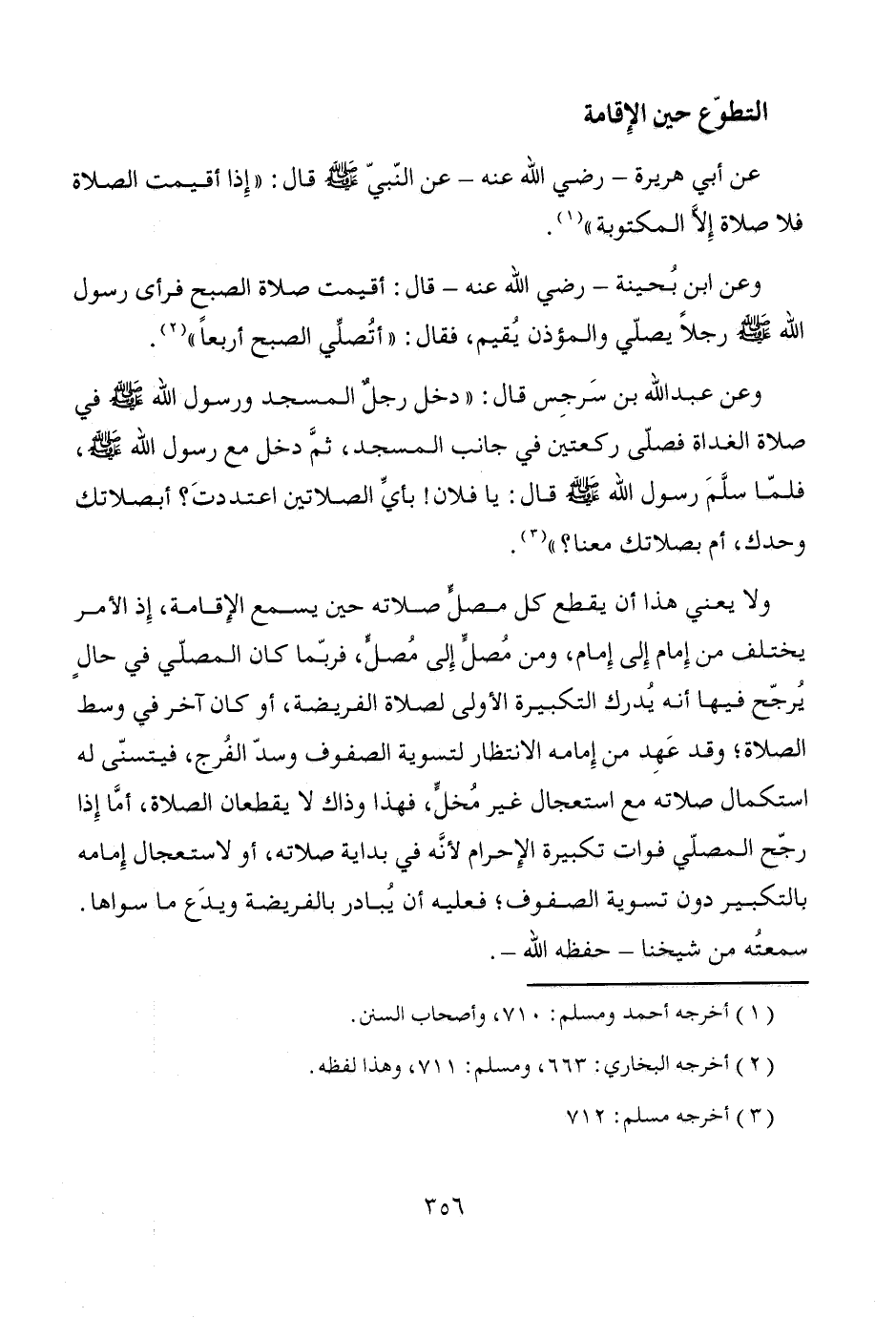 ولا يعني هذا أن يقطع كل مصلٍّ صلاته حين يسمع الإِقامة، إِذ الأمر يختلف من إِمام إِلى إِمام، ومن مُصلٍّ إِلى مُصلٍّ، فربّما كان المصلّي في حالٍ يُرجّح فيها أنه يُدرك التكبيرة الأولى لصلاة الفريضة، أو كان آخر في وسط الصلاة، وقد عَهِد من إمامه الانتظار لتسوية الصفوف وسدّ الفُرج، فيتسنّى له استكمال صلاته مع استعجال غير مُخلٍّ، فهذا وذاك لا يقطعان الصلاة، أمَّا إِذا رجّح المصلّي فوات تكبيرة الإِحرام لأنَّه في بداية صلاته، أو لاستعجال إمامه بالتكبير دون تسوية الصفوف؛ فعليه أن يُبادر بالفريضة ويدَع ما سواها. سمعتُه من شيخنا -حفظه الله-.