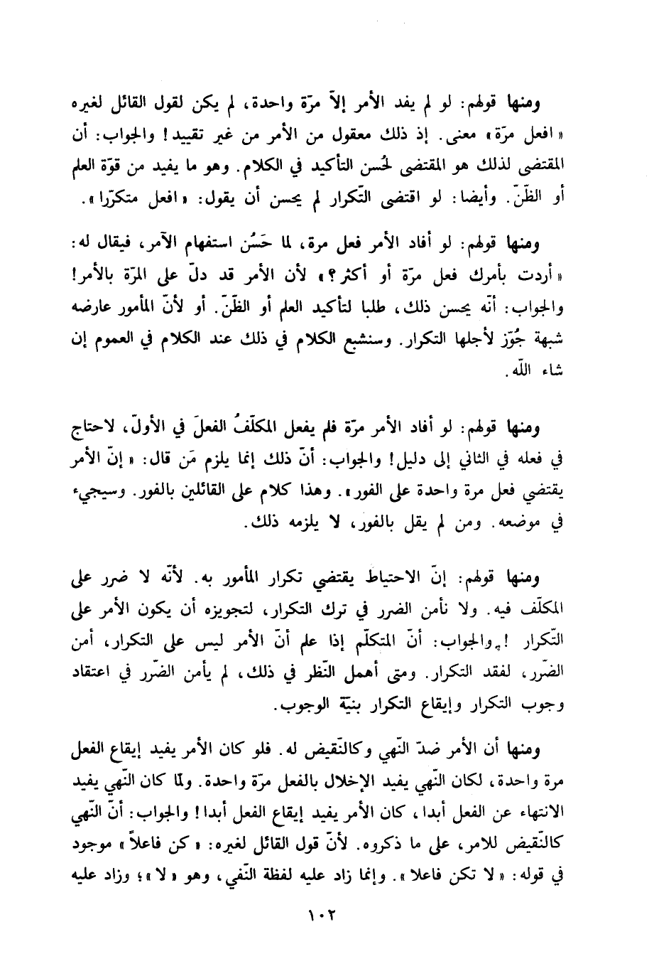 وَمِنْهَا قَوْلهم لَو أَفَادَ الْأَمر فعل مرّة لما حسن اسْتِفْهَام الْآمِر فَيُقَال لَهُ اردت بِأَمْرك فعل مرّة أَو أَكثر لِأَن الْأَمر قد دلّ على الْمرة بِالْأَمر وَالْجَوَاب أَنه يحسن ذَلِك طلبا لتأكيد الْعلم أَو الظَّن أَو لِأَن الْمَأْمُور عَارضه شُبْهَة جوز لأَجلهَا التّكْرَار وسنشبع الْكَلَام فِي ذَلِك عِنْد الْكَلَام فِي الْعُمُوم إِن شَاءَ الله