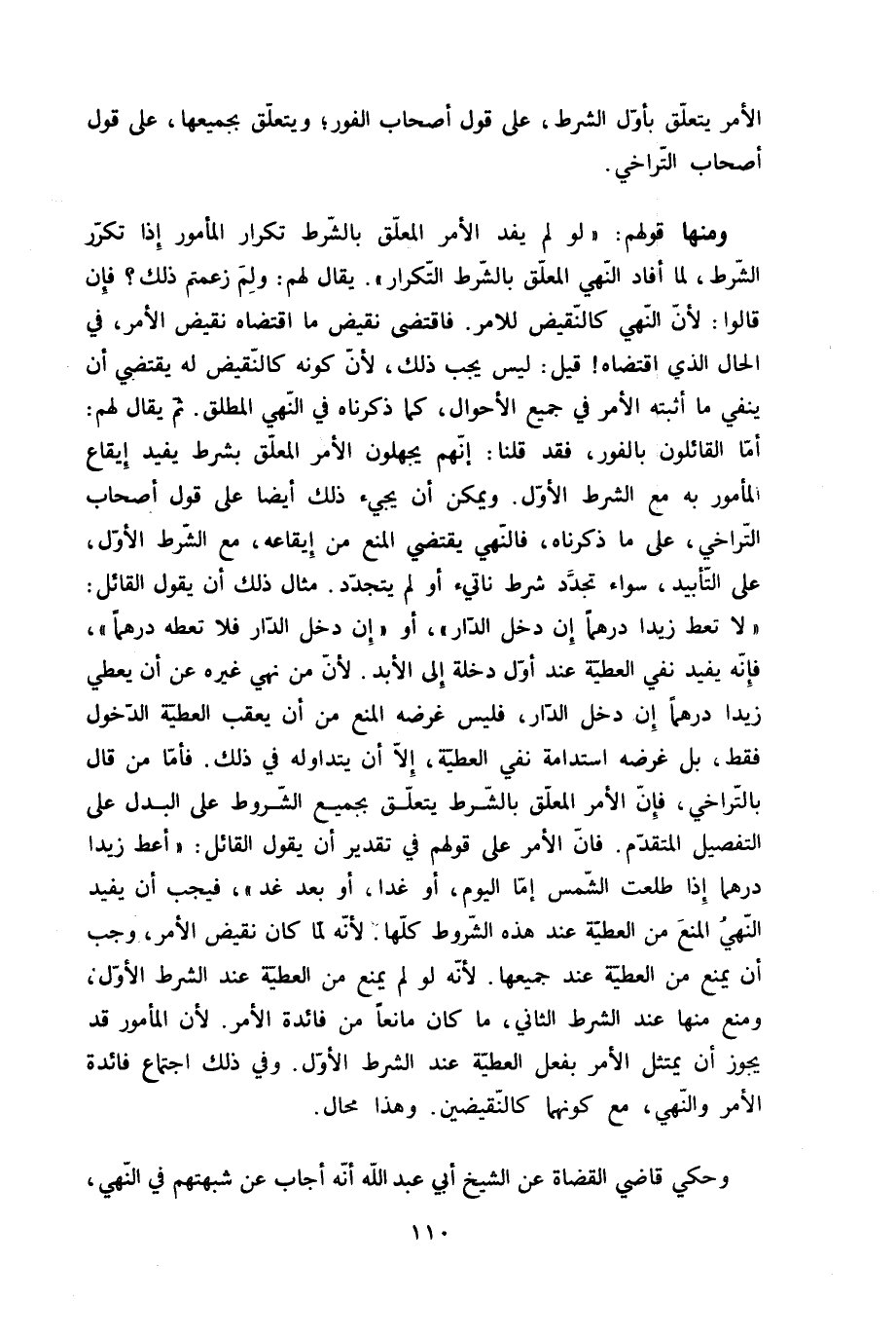 وَمِنْهَا قَوْلهم لَو لم يفد الْأَمر الْمُعَلق بِالشّرطِ تكْرَار الْمَأْمُور إِذا تكَرر الشَّرْط لما أَفَادَ النَّهْي الْمُعَلق بِالشّرطِ التّكْرَار يُقَال لَهُم وَلم زعمتم ذَلِك فَإِن قَالُوا لِأَن النَّهْي كالنقيض للامر فَاقْتضى نقيض مَا اقْتَضَاهُ نقيض الْأَمر فِي الْحَال الَّذِي اقْتَضَاهُ قيل لَيْسَ يجب ذَلِك لِأَن كَونه كالنقيض لَهُ يَقْتَضِي أَن يَنْفِي مَا أثْبته الْأَمر فِي جَمِيع الْأَحْوَال كَمَا ذَكرْنَاهُ فِي النَّهْي الْمُطلق ثمَّ يُقَال لَهُم أما الْقَائِلُونَ بالفور فقد قُلْنَا إِنَّهُم يجهلون الْأَمر الْمُعَلق بِشَرْط يُفِيد إِيقَاع الْمَأْمُور بِهِ مَعَ الشَّرْط الأول وَيُمكن أَن يَجِيء ذَلِك أَيْضا على قَول أَصْحَاب التَّرَاخِي على مَا ذَكرْنَاهُ فالنهي يَقْتَضِي الْمَنْع من إِيقَاعه مَعَ الشَّرْط الأول على التَّأْبِيد سَوَاء تجدّد شَرط ناتيء أَو لم يَتَجَدَّد مِثَال ذَلِك أَن يَقُول الْقَائِل لَا تعط زيدا درهما إِن دخل الدَّار أَو إِن دخل الدَّار فَلَا تعطه درهما فَإِنَّهُ يُفِيد نفي الْعَطِيَّة عِنْد أول دخلة إِلَى الْأَبَد لِأَن من نهي غَيره عَن أَن يُعْطي زيدا درهما إِن دخل الدَّار فَلَيْسَ غَرَضه الْمَنْع من أَن يعقب الْعَطِيَّة الدُّخُول فَقَط بل غَرَضه اسْتِدَامَة نفي الْعَطِيَّة إِلَّا أَن يتداوله فِي ذَلِك فَأَما من قَالَ بالتراخي فَإِن الْأَمر الْمُعَلق بِالشّرطِ يتَعَلَّق بِجَمِيعِ الشُّرُوط على الْبَدَل على التَّفْصِيل الْمُتَقَدّم فان الْأَمر على قَوْلهم فِي تَقْدِير أَن يَقُول الْقَائِل اعط زيدا درهما إِذا طلعت الشَّمْس أما الْيَوْم أَو غَدا أَو بعد غَد فَيجب أَن يُفِيد النَّهْي الْمَنْع من الْعَطِيَّة عِنْد هَذِه الشُّرُوط كلهَا لِأَنَّهُ لما كَانَ نقيض الْأَمر وَجب أَن يمْنَع من الْعَطِيَّة عِنْد جَمِيعهَا لِأَنَّهُ لَو لَو يمْنَع من الْعَطِيَّة عِنْد الشَّرْط الأول وَمنع مِنْهَا عِنْد الشَّرْط الثَّانِي مَا كَانَ مَانِعا من فَائِدَة الْأَمر لِأَن الْمَأْمُور قد يجوز أَن يمتثل الْأَمر بِفعل الْعَطِيَّة عِنْد الشَّرْط الأول وَفِي ذَلِك اجْتِمَاع فَائِدَة الْأَمر وَالنَّهْي مَعَ كَونهمَا كالنقيضين وَهَذَا محَال