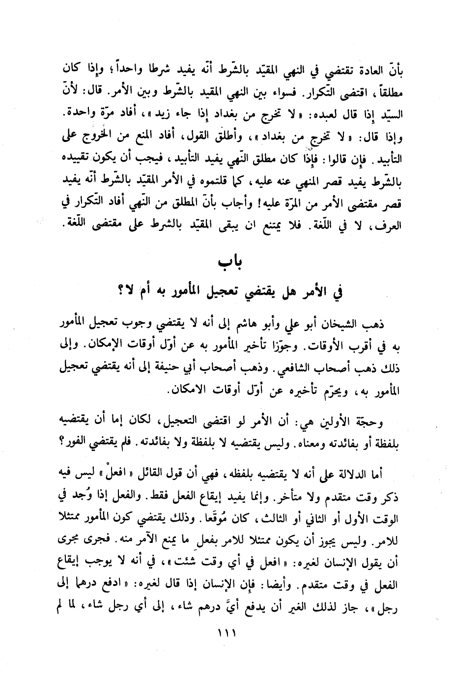 ذهب الشَّيْخَانِ أَبُو عَليّ وَأَبُو هَاشم إِلَى أَنه لَا يَقْتَضِي وجوب تَعْجِيل الْمَأْمُور بِهِ فِي أقرب الْأَوْقَات وجوزا تَأْخِير الْمَأْمُور بِهِ عَن أول اوقات الْإِمْكَان وَإِلَى ذَلِك ذهب أَصْحَاب الشَّافِعِي وَذهب أَصْحَاب أبي حنيفَة إِلَى أَنه يَقْتَضِي تَعْجِيل الْمَأْمُور بِهِ وَيحرم تَأْخِيره عَن أول أَوْقَات الْإِمْكَان