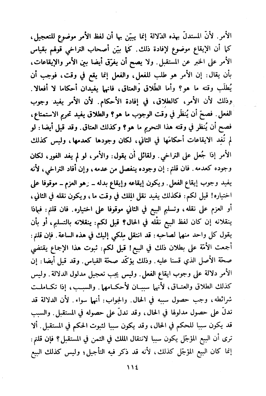 الْأَمر لِأَن الْمُسْتَدلّ بِهَذِهِ الدّلَالَة إِنَّمَا يبين بهَا أَن لفظ الْأَمر مَوْضُوع للتعجيل كَمَا أَن الإ يقاع مَوْضُوع لإِفَادَة ذَلِك كَمَا بَين اصحاب التَّرَاخِي قَوْلهم بِقِيَاس الْأَمر على الْخَبَر عَن الْمُسْتَقْبل وَلَا يَصح أَن يفرق أَيْضا بَين الْأَمر والإيقاعات بِأَن يُقَال إِن الْأَمر هُوَ طلب للْفِعْل وَالْفِعْل إِنَّمَا يَقع فِي وَقت فَوَجَبَ أَن يطْلب وقته مَا هُوَ وَأما الطَّلَاق وَالْعتاق فانهما يفيدان أحكاما لَا أفعالا وَذَلِكَ لِأَن الْأَمر كاطلاق فِي إِفَادَة الألحكام لِأَن الْأَمر يُفِيد وجوب الْفِعْل فصح أَن ينظر فِي وَقت الْوُجُوب مَا هُوَ وَالطَّلَاق يُفِيد تَحْرِيم الِاسْتِمْتَاع فصح أَن ينظر فِي وقته هَذَا التَّحْرِيم مَا هُوَ وَكَذَلِكَ الْعتاق وَقد قيل أَيْضا لَو لم تفد الإيقاعات أَحْكَامهَا فِي الثَّانِي لَكَانَ وجودهَا كعدمها وَلَيْسَ كَذَلِك الْأَمر إِذا جعل على التَّرَاخِي وَلقَائِل أَن يَقُول وَالْأَمر لَو لم يفد الْفَوْر لَكَانَ وجوده كَعَدَمِهِ فان قُلْتُمْ إِن وجوده ينْفَصل من عَدمه وَإِن أَفَادَ التَّرَاخِي لِأَنَّهُ يُفِيد وجوب إِيقَاع الْفِعْل وَيكون إِيقَاعه وإيقاع بدله وَهُوَ الْعَزْم مَوْقُوفا على اخْتِيَاره قيل لكم فَكَذَلِك يُفِيد نقل الْملك فِي وَقت مَا وَيكون نَقله فِي الثَّانِي أَو الْعَزْم على نَقله وَتَسْلِيم البيع فِي الثَّانِي مَوْقُوفا على اخْتِيَاره فان قُلْتُمْ فبماذا ينقلانه إِن كَانَ لفظ البيع نَقله فِي الْحَال قيل لكم ينقلانه بِالتَّسْلِيمِ أَو بِأَن يَقُول كل وَاحِد مِنْهُمَا لصَاحبه قد انْتقل ملكي إِلَيْك فِي هَذِه السَّاعَة فَإِن قُلْتُمْ أَجمعت الْأمة على بطلَان ذَلِك فِي البيع قيل لكم ثُبُوت هَذَا الْإِجْمَاع يَقْتَضِي صِحَة الأَصْل الَّذِي قسنا عَلَيْهِ وَذَلِكَ يُؤَكد صِحَة الْقيَاس وَقد قيل أَيْضا إِن الْأَمر دلَالَة على وجوب إِيقَاع الْفِعْل وَلَيْسَ يجب تَعْجِيل مَدْلُول الدّلَالَة وَلَيْسَ كَذَلِك الطَّلَاق وَالْعتاق لِأَنَّهُمَا سببان لأحكامهما وَالسَّبَب إِذا تكاملت شَرَائِطه وَجب حُصُول سَببه فِي الْحَال وَالْجَوَاب أَنَّهُمَا سَوَاء لِأَن الدّلَالَة قد تدل على حُصُول مدلولها فِي الْحَال وَقد تدل على حُصُوله فِي الْمُسْتَقْبل وَالسَّبَب قد يكون سَببا للْحكم فِي الْحَال وَقد يكون سَببا لثُبُوت الحكم فِي الْمُسْتَقْبل أَلا ترى أَن البيع الْمُؤَجل يكون سَببا لانتقال الْملك فِي الثّمن فِي الْمُسْتَقْبل فَإِن قُلْتُمْ إِنَّمَا كَانَ البيع الْمُؤَجل كَذَلِك لِأَنَّهُ قد ذكر فِيهِ التَّأْجِيل وَلَيْسَ كَذَلِك البيع