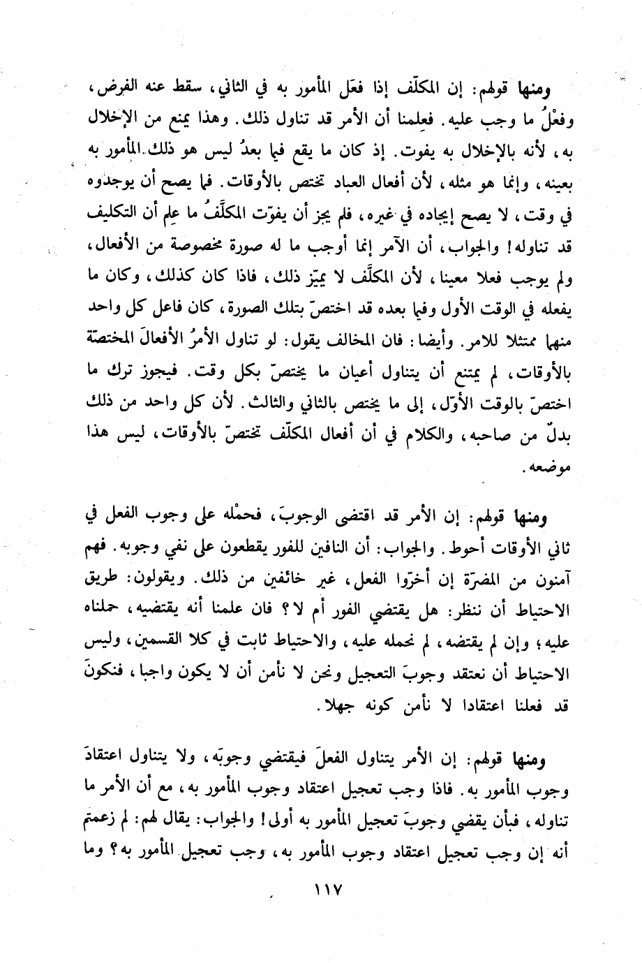 وَمِنْهَا قَوْلهم إِن الْأَمر يتَنَاوَل الْفِعْل فَيَقْتَضِي وُجُوبه وَلَا يتَنَاوَل اعْتِقَاد وجوب الْمَأْمُور بِهِ فاذا وَجب تَعْجِيل اعْتِقَاد وجوب الْمَأْمُور بِهِ مَعَ أَن الْأَمر مَا تنَاوله فبأن يقْضِي وجوب تَعْجِيل الْمَأْمُور بِهِ أولى وَالْجَوَاب يُقَال لَهُم لم زعمتم أَنه إِن وَجب تَعْجِيل اعْتِقَاد وجوب الْمَأْمُور بِهِ وَجب تَعْجِيل الْمَأْمُور بِهِ وَمَا