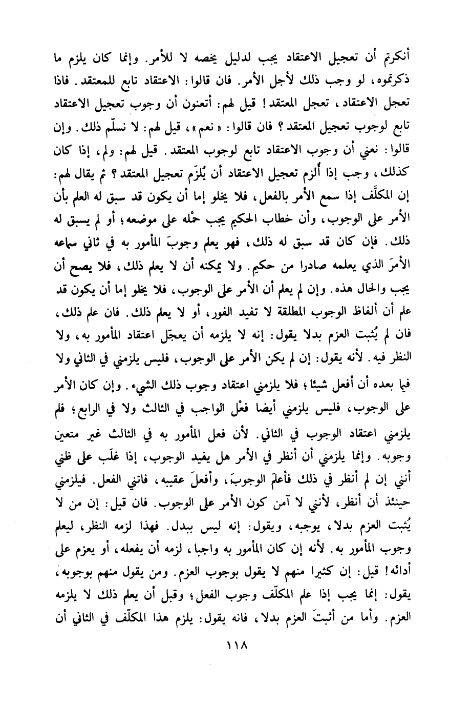 أنكرتم أَن تَعْجِيل الِاعْتِقَاد يجب لدَلِيل يَخُصُّهُ لَا لِلْأَمْرِ وَإِنَّمَا كَانَ يلْزم مَا ذكرتموه لَو وَجب ذَلِك لأجل الْأَمر فان قَالُوا الِاعْتِقَاد تَابع للمعتقد فاذا تعجل الِاعْتِقَاد تعجل المعتقد قيل لَهُم أتعنون أَن وجوب تَعْجِيل الِاعْتِقَاد تَابع لوُجُوب تَعْجِيل المعتقد فان قَالُوا نعم قيل لَهُم لَا نسلم ذَلِك وَإِن قَالُوا نعني أَن وجوب الِاعْتِقَاد تَابع لوُجُوب المعتقد قيل لَهُم وَلم إِذا كَانَ كَذَلِك وَجب إِذا الزم تَعْجِيل الِاعْتِقَاد أَن يلْزم تَعْجِيل المعتقد ثمَّ يُقَال لَهُم إِن الْمُكَلف إِذا سمع الْأَمر بِالْفِعْلِ فَلَا يَخْلُو إِمَّا أَن يكون قد سبق لَهُ الْعلم بِأَن الْأَمر على الْوُجُوب وَأَن خطاب الْحَكِيم يجب حمله على مَوْضِعه أَو لم يسْبق لَهُ ذَلِك فَإِن كَانَ قد سبق لَهُ ذَلِك فَهُوَ يعلم وجوب الْمَأْمُور بِهِ فِي ثَانِي سَمَاعه الْأَمر الَّذِي يُعلمهُ صادرا من حَكِيم وَلَا يُمكنهُ أَن لَا يعلم ذَلِك فَلَا يَصح أَن يجب وَالْحَال هَذِه وَإِن لم يعلم أَن الْأَمر على الْوُجُوب فَلَا يَخْلُو إِمَّا أَن يكون قد علم أَن أَلْفَاظ الْوُجُوب الْمُطلقَة لَا تفِيد الْفَوْر أَو لَا يعلم ذَلِك فان علم ذَلِك فان لم يثبت الْعَزْم بَدَلا يَقُول إِنَّه لَا يلْزمه أَن يعجل اعْتِقَاد الْمَأْمُور بِهِ وَلَا النّظر فِيهِ لِأَنَّهُ يَقُول إِن لم يكن الْأَمر على الْوُجُوب فَلَيْسَ يلْزَمنِي فِي الثَّانِي وَلَا فِيمَا بعده أَن أفعل شَيْئا فَلَا يلْزَمنِي اعْتِقَاد وجوب ذَلِك الشَّيْء وَإِن كَانَ الْأَمر على الْوُجُوب فَلَيْسَ يلْزَمنِي أَيْضا فعل الْوَاجِب فِي الثَّالِث وَلَا فِي الرَّابِع فَلم يلْزَمنِي اعْتِقَاد الْوُجُوب فِي الثَّانِي لِأَن فعل الْمَأْمُور بِهِ فِي الثَّالِث غير مُتَعَيّن وُجُوبه وَإِنَّمَا يلْزَمنِي أَن انْظُر فِي الْأَمر هَل يُفِيد الْوُجُوب إِذا غلب على ظَنِّي أنني إِن لم أنظر فِي ذَلِك فَأعْلم الْوُجُوب وأفعل عقيبة فَاتَنِي الْفِعْل فيلزمني حِينَئِذٍ أَن أنظر لأنني لَا آمن كَون الْأَمر على الْوُجُوب فان قيل إِن من لَا يثبت الْعَزْم بَدَلا يُوجِبهُ وَيَقُول إِنَّه لَيْسَ بِبَدَل فَهَذَا لزمَه النّظر ليعلم وجوب الْمَأْمُور بِهِ لِأَنَّهُ إِن كَانَ الْمَأْمُور بِهِ وَاجِبا لزمَه أَن يَفْعَله أَو يعزم على أَدَائِهِ قيل إِن كثيرا مِنْهُم لَا يَقُول بِوُجُوب الْعَزْم وَمن يَقُول مِنْهُم بِوُجُوبِهِ يَقُول إِنَّمَا يجب إِذا علم الْمُكَلف وجوب الْفِعْل وَقبل أَن يعلم ذَلِك لَا يلْزمه الْعَزْم وَأما من أثبت الْعَزْم بَدَلا فانه يَقُول يلْزم هَذَا الْمُكَلف فِي الثَّانِي أَن