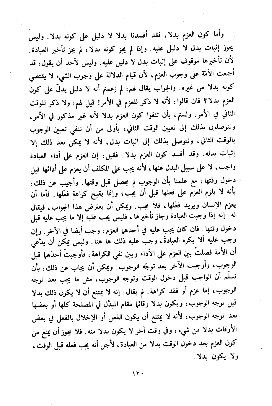 وَأما كَون الْعَزْم بَدَلا فقد أفسدنا بَدَلا لَا دَلِيل على كَونه بَدَلا وَلَيْسَ يجوز إِثْبَات بدل لَا دَلِيل عَلَيْهِ وَإِذا لم يجز كَونه بَدَلا لم يجز تاخير الْعِبَادَة لِأَن تَأْخِيرهَا مَوْقُوف على إِثْبَات بدل لَا دَلِيل عَلَيْهِ وَلَيْسَ لأحد أَن يَقُول قد أَجمعت الْأمة على وجوب الْعَزْم لِأَن قيام الدّلَالَة على وجوب الشَّيْء لَا يَقْتَضِي كَونه بَدَلا من غَيره وَالْجَوَاب يُقَال لَهُم لم زعمتم أَنه لَا دَلِيل يدل على كَون الْعَزْم بَدَلا فان قَالُوا لِأَنَّهُ لَا ذكر للعزم فِي الْأَمر قيل لَهُم وَلَا ذكر للْوَقْت الثَّانِي فِي الْأَمر ولستم بِأَن تنفوا كَون الْعَزْم بَدَلا لِأَنَّهُ غير مَذْكُور فِي الْأَمر وتتوصلون بذلك إِلَى تعْيين الْوَقْت الثَّانِي بِأولى من أَن ننفي تعْيين الْوُجُوب بِالْوَقْتِ الثَّانِي ونتوصل بذلك إِلَى اثبات بدل لِأَنَّهُ لَا يُمكن بعد ذَلِك إِلَّا إِثْبَات بدله وَقد أفسد كَون الْعَزْم بَدَلا فَقيل إِن الْعَزْم على أَدَاء الْعِبَادَة وَاجِب لَا على سَبِيل الْبَدَل عَنْهَا لِأَنَّهُ يجب على الْمُكَلف أَن يعزم على أَدَائِهَا قبل دُخُول وَقتهَا مَعَ علمنَا بِأَن الْوُجُوب لم يحصل قبل وَقتهَا وَأجِيب عَن ذَلِك بِأَنَّهُ لَا يلْزم الْعَزْم على فعلهَا قبل أَن يجب وَإِنَّمَا يقبح كَرَاهَة فعلهَا فَأَما أَن يعزم الْإِنْسَان وَيُرِيد فعلهَا فَلَا يجب وَيُمكن أَن يعْتَرض هَذَا الْجَواب فَيُقَال لَهُ إِنَّه إِذا وَجَبت الْعِبَادَة وَجَاز تَأْخِيرهَا فَلَيْسَ يجب عَلَيْهِ إِلَّا مَا يجب عَلَيْهِ قبل دُخُول وَقتهَا فان كَانَ يجب عَلَيْهِ فِي أَحدهمَا الْعَزْم وَجب أَيْضا فِي الآخر وَإِن وَجب عَلَيْهِ أَلا يكره الْعِبَادَة وَجب عَلَيْهِ ذَلِك هَا هُنَا وَلَيْسَ يُمكن أَن يَدعِي أَن الْأمة فصلت بَين الْعَزْم على الْأَدَاء وَبَين نفي الْكَرَاهَة فأوجبت أَحدهمَا قبل الْوُجُوب وأوجبت الآخر بعد توجه الْوُجُوب وَيُمكن أَن يُجَاب عَن ذَلِك بِأَن نسلم أَن الْوَاجِب قبل دُخُول الْوَقْت وَتوجه الْوُجُوب مثل مَا يجب بعد توجه الْوُجُوب إِمَّا عزم أَو فقد كَرَاهَة ثمَّ يُقَال إِنَّه لَا يمْتَنع أَن لَا يكون ذَلِك بَدَلا قبل توجه الْوُجُوب وَيكون بَدَلا وَقَائِمًا مقَام الْمُبدل فِي الْمصلحَة كلهَا أَو بَعْضهَا بعد توجه الْوُجُوب لِأَنَّهُ لَا يمْتَنع أَن يكون الْفِعْل أَو الْإِخْلَال بِالْفِعْلِ فِي بعض الْأَوْقَات بَدَلا من شَيْء وَفِي وَقت آخر لَا يكون بَدَلا مِنْهُ فَلَا يجوز أَن يمْنَع من كَون الْعَزْم بعد دُخُول الْوَقْت بَدَلا من الْعِبَادَة لأجل أَنه يجب فعله قبل الْوَقْت وَلَا يكون بَدَلا