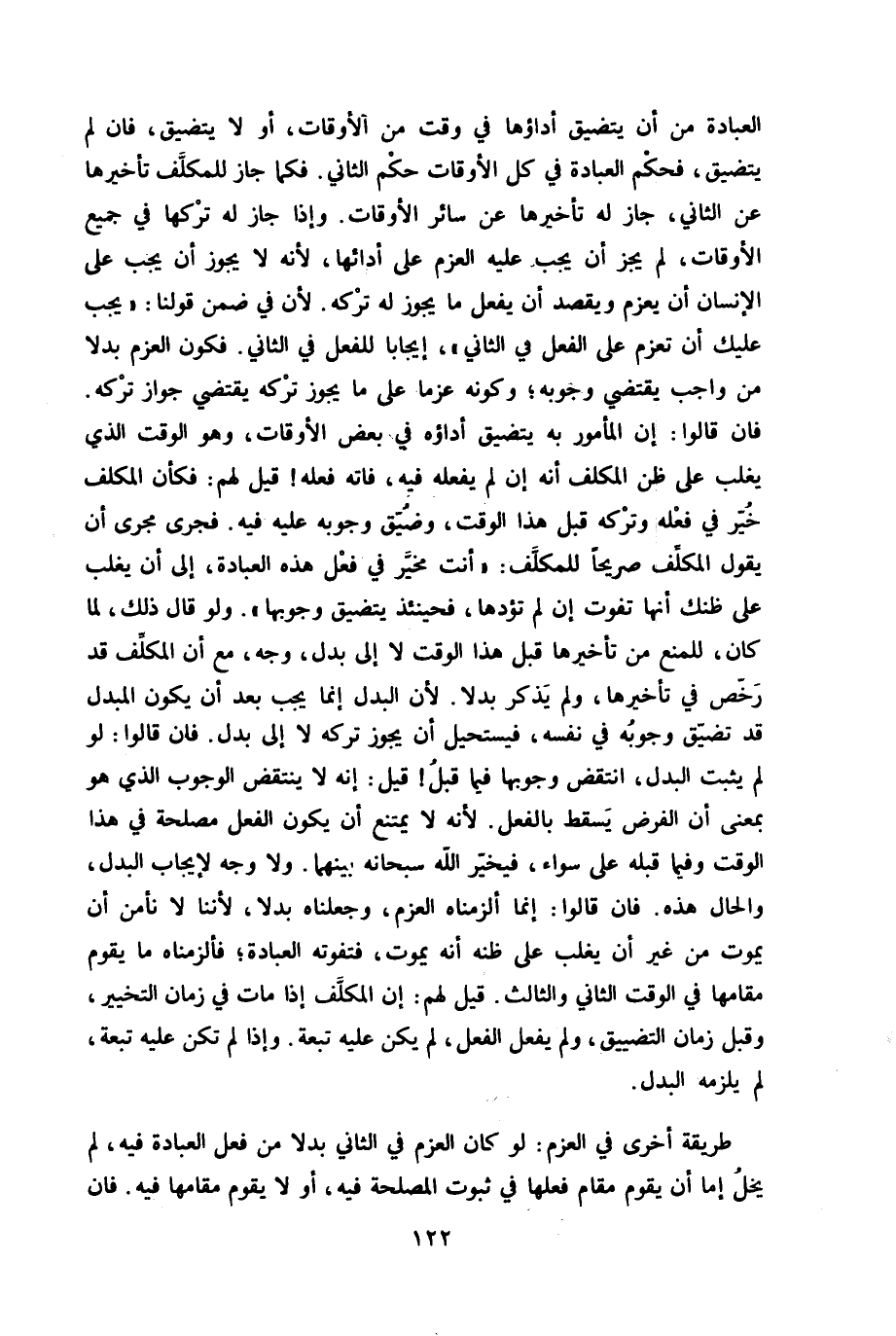 الْعِبَادَة من أَن يتضيق أَدَاؤُهَا فِي وَقت من الْأَوْقَات أَو لَا يتضيق فان لم يتضيق فَحكم الْعِبَادَة فِي كل الْأَوْقَات حكم الثَّانِي فَكَمَا جَازَ للمكلف تَأْخِيرهَا عَن الثَّانِي جَازَ لَهُ تَأْخِيرهَا عَن سَائِر الْأَوْقَات وَإِذا جَازَ لَهُ تَركهَا فِي جَمِيع الْأَوْقَات لم يجز أَن يجب عَلَيْهِ الْعَزْم على أَدَائِهَا لِأَنَّهُ لَا يجوز أَن يجب على الْإِنْسَان أَن يعزم ويقصد أَن يفعل مَا يجوز لَهُ تَركه لِأَن فِي ضمن قَوْلنَا يجب عَلَيْك أَن تعزم على الْفِعْل فِي الثَّانِي إِيجَابا للْفِعْل فِي الثَّانِي فكون الْعَزْم بَدَلا من وَاجِب يَقْتَضِي وُجُوبه وَكَونه عزما على مَا يجوز تَركه يَقْتَضِي جَوَاز تَركه فان قَالُوا إِن الْمَأْمُور بِهِ يتضيق أَدَاؤُهُ فِي بعض الْأَوْقَات وَهُوَ الْوَقْت الَّذِي يغلب على ظن الْمُكَلف أَنه إِن لم يَفْعَله فِيهِ فَاتَهُ فعله قيل لَهُم فَكَأَن الْمُكَلف خير فِي فعله وَتَركه قبل هَذَا الْوَقْت وضيق وُجُوبه عَلَيْهِ فِيهِ فَجرى مجْرى أَن يَقُول الْمُكَلف صَرِيحًا للمكلف أَنْت مُخَيّر فِي فعل هَذِه الْعِبَادَة إِلَى أَن يغلب على ظَنك أَنَّهَا تفوت إِن لم تؤدها فَحِينَئِذٍ يتضيق وُجُوبهَا وَلَو قَالَ ذَلِك لما كَانَ للْمَنْع من تَأْخِيرهَا قبل هَذَا الْوَقْت لَا إِلَى بدل وَجه مَعَ أَن الْمُكَلف قد رخص فِي تَأْخِيرهَا وَلم يذكر بَدَلا لِأَن الْبَدَل إِنَّمَا يجب بعد أَن يكون الْمُبدل قد تضيق وُجُوبه فِي نَفسه فيستحيل أَن يجوز تَركه لَا إِلَى بدل فان قَالُوا لَو لم يثبت الْبَدَل انْتقض وُجُوبهَا فِيمَا قبل قيل إِنَّه لَا ينْتَقض الْوُجُوب الَّذِي هُوَ بِمَعْنى أَن الفوض يسْقط بِالْفِعْلِ لِأَنَّهُ لَا يمْتَنع أَن يكون الْفِعْل مصلحَة فِي هَذَا الْوَقْت وَفِيمَا قبله على سَوَاء فَيُخَير الله سُبْحَانَهُ بَينهمَا وَلَا وَجه لإِيجَاب الْبَدَل وَالْحَال هَذِه فان قَالُوا إِنَّمَا ألزمناه الْعَزْم وجعلناه بَدَلا لأننا لَا نَأْمَن أَن يَمُوت من غير أَن يغلب على ظَنّه أَنه يَمُوت فتفوته الْعِبَادَة فألزمناه مَا يقوم مقَامهَا فِي الْوَقْت الثَّانِي وَالثَّالِث قيل لَهُم إِن الْمُكَلف إِذا مَاتَ فِي زمَان التَّخْيِير وَقبل زمَان التَّضْيِيق وَلم يفعل الْفِعْل لم يكن عَلَيْهِ تبعة وَإِذا لم تكن عَلَيْهِ تبعة لم يلْزمه الْبَدَل