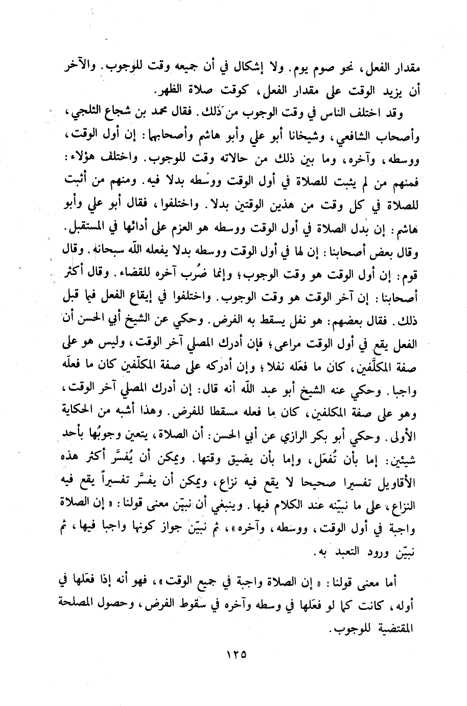 وَقد اخْتلف النَّاس فِي وَقت الْوُجُوب من ذَلِك فَقَالَ مُحَمَّد بن شُجَاع الثَّلْجِي وَأَصْحَاب الشَّافِعِي وشيخانا أَبُو عَليّ وَأَبُو هَاشم وأصحابهما إِن أول الْوَقْت ووسطه وَآخره وَمَا بَين ذَلِك من حالاته وَقت للْوُجُوب وَاخْتلف هَؤُلَاءِ فَمنهمْ من لم يثبت للصَّلَاة فِي أول الْوَقْت ووسطه بَدَلا فِيهِ وَمِنْهُم من أثبت للصَّلَاة فِي كل وَقت من هذَيْن الْوَقْتَيْنِ بَدَلا وَاخْتلفُوا فَقَالَ أَبُو عَليّ وَأَبُو هَاشم إِن بدل الصَّلَاة فِي أول الْوَقْت ووسطه هُوَ الْعَزْم على أَدَائِهَا فِي الْمُسْتَقْبل وَقَالَ بعض أَصْحَابنَا إِن لَهَا فِي أول الْوَقْت ووسطه بَدَلا يَفْعَله الله سُبْحَانَهُ وَقَالَ قوم إِن أول الْوَقْت هُوَ وَقت الْوُجُوب وَإِنَّمَا ضرب آخِره للْقَضَاء وَقَالَ أَكثر اصحابنا إِن آخر الْوَقْت هُوَ وَقت الْوُجُوب وَاخْتلفُوا فِي إِيقَاع الْفِعْل فِيمَا قبل ذَلِك فَقَالَ بَعضهم هُوَ نفل يسْقط بِهِ الْفَرْض وَحكي عَن الشَّيْخ ابي الْحسن أَن الْفِعْل يَقع فِي أول الْوَقْت مراعى فَإِن أدْرك الْمُصَلِّي آخر الْوَقْت وَلَيْسَ هُوَ على صفة الْمُكَلّفين كَانَ مَا فعله نفلا وَإِن أدْركهُ على صفة الْمُكَلّفين كَانَ مَا فعله وَاجِبا وَحكي عَنهُ الشَّيْخ أَبُو عبد الله أَنه قَالَ إِن أدْرك الْمُصَلِّي آخر الْوَقْت وَهُوَ على صفة الْمُكَلّفين كَانَ مَا فعله مسْقطًا المفرض وَهَذَا أشبه من الْحِكَايَة الأولى وَحكي أَبُو بكر الرَّازِيّ عَن أبي الْحسن أَن الصَّلَاة يتَعَيَّن وُجُوبهَا بِأحد شَيْئَيْنِ إِمَّا بِأَن تفعل وَإِمَّا بِأَن يضيق وَقتهَا وَيُمكن أَن يُفَسر أَكثر هَذِه الْأَقَاوِيل تَفْسِيرا صَحِيحا لَا يَقع فِيهِ نزاع وَيُمكن أَن يُفَسر تَفْسِيرا يَقع فِيهِ النزاع على مَا نبينه عِنْد الْكَلَام فِيهَا وَيَنْبَغِي أَن نبين معنى قَوْلنَا إِن الصَّلَاة وَاجِبَة فِي أول الْوَقْت ووسطه وَآخره ثمَّ نبين جَوَاز كَونهَا وَاجِبا فِيهَا ثمَّ نبين وُرُود التَّعَبُّد بِهِ