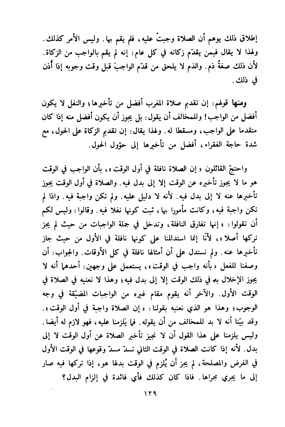 وَاحْتج الْقَائِلُونَ إِن الصَّلَاة نَافِلَة فِي أول الْوَقْت بِأَن الْوَاجِب فِي الْوَقْت هُوَ مَا لَا يجوز تَأْخِيره عَن الْوَقْت إِلَّا إِلَى بدل فِيهِ وَالصَّلَاة فِي أول الْوَقْت يجوز تَأْخِيرهَا عَنهُ لَا إِلَى بدل فِيهِ لِأَنَّهُ لَا دَلِيل عَلَيْهِ وَلم تكن وَاجِبَة فِيهِ وَإِذا لم تكن وَاجِبَة فِيهِ وَكَانَت مَأْمُورا بهَا ثَبت كَونهَا نفلا فِيهِ وَقَالُوا وَلَيْسَ لكم أَن تَقولُوا إِنَّهَا تفارق النَّافِلَة وَتدْخل فِي جملَة الْوَاجِبَات من حَيْثُ لم يجز تَركهَا أصلا لأَنا إِنَّمَا استدللنا على كَونهَا نَافِلَة فِي الأول من حَيْثُ جَازَ تَأْخِيرهَا عَنهُ وَلم نستدل على أَن أَمْثَالهَا نَافِلَة فِي كل الْأَوْقَات وَالْجَوَاب أَن وَصفنَا للْفِعْل بِأَنَّهُ وَاجِب فِي الْوَقْت يسْتَعْمل على وَجْهَيْن أَحدهمَا أَنه لَا يجوز الْإِخْلَال بِهِ فِي ذَلِك الْوَقْت إِلَّا إِلَى بدل فِيهِ وَهَذَا لَا نعينه فِي الصَّلَاة فِي الْوَقْت الأول وَالْآخر أَنه يقوم مقَام غَيره من الْوَاجِبَات المضيقة فِي وَجه الْوُجُوب وَهَذَا هُوَ الَّذِي نعنيه بقولنَا إِن الصَّلَاة وَاجِبَة فِي أول الْوَقْت وَقد بَينا أَنه لَا بُد للمخالف من أَن يَقُوله فَمَا يلْزمنَا عَلَيْهِ فَهُوَ لَازم لَهُ ايضا وَلَيْسَ يلْزمنَا على هَذَا القَوْل أَن لَا نجيز تَأْخِير الصَّلَاة عَن أول الْوَقْت لَا إِلَى بدل لِأَنَّهُ إِذا كَانَت الصَّلَاة فِي الْوَقْت الثَّانِي تسد مسد وُقُوعهَا فِي الْوَقْت الأول فِي الْفَرْض والمصلحة لم يجز أَن يلْزم فِي الْوَقْت بدلهَا هُوَ إِذا تَركهَا فِيهِ صَار إِلَى مَا يجْرِي مجْراهَا فاذا كَانَ كَذَلِك فَأَي فَائِدَة فِي إِلْزَام الْبَدَل