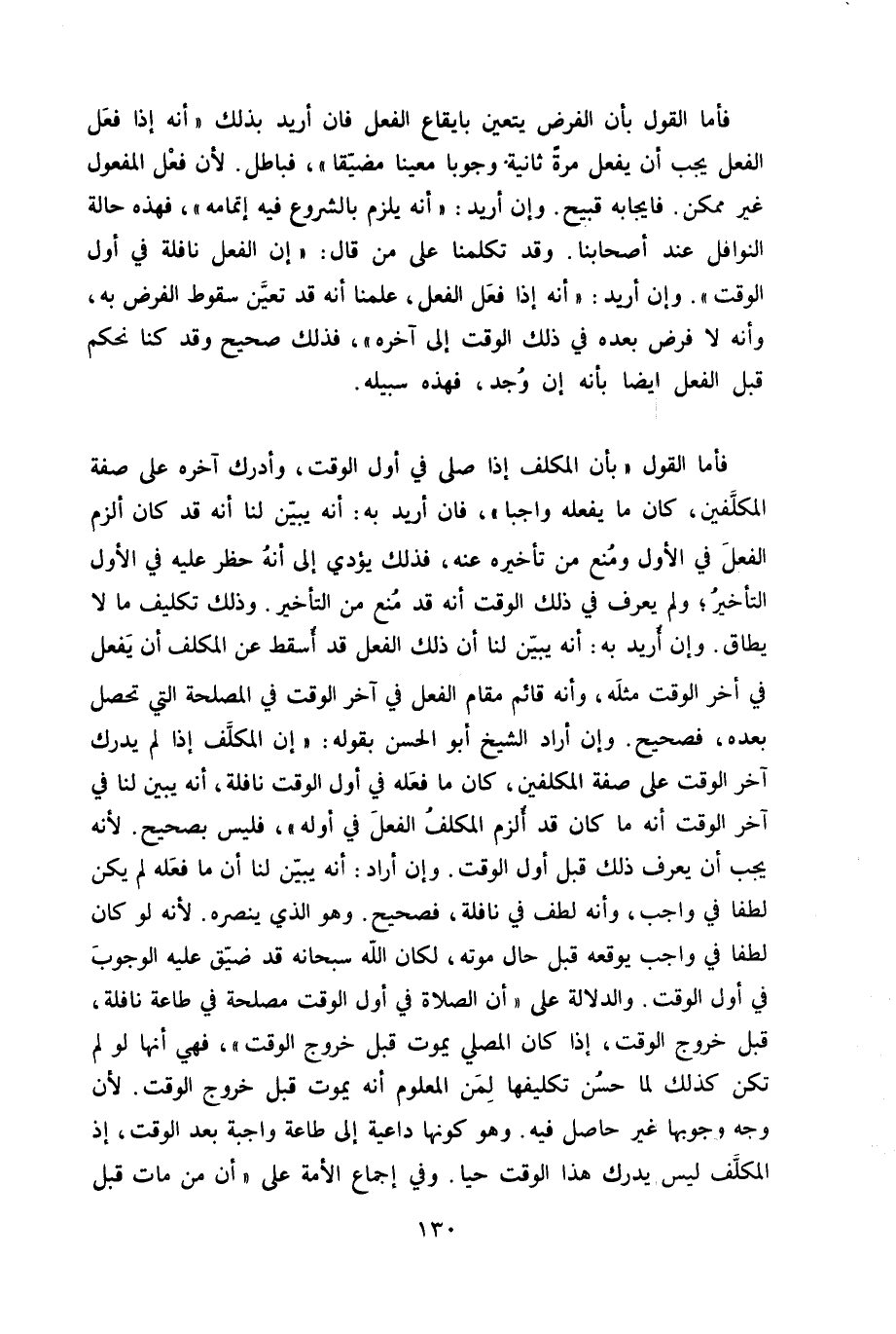 فَأَما القَوْل بِأَن الْمُكَلف إِذا صلى فِي أول الْوَقْت وَأدْركَ آخِره على صفة الْمُكَلّفين كَانَ مَا يَفْعَله وَاجِبا فان أُرِيد بِهِ أَنه يبين لنا أَنه قد كَانَ ألزم الْفِعْل فِي الأول وَمنع من تَأْخِيره عَنهُ فَذَلِك يُؤَدِّي إِلَى أَنه حظر عَلَيْهِ فِي الأول التاخير وَلم يعرف فِي ذَلِك الْوَقْت أَنه قد منع من التَّأْخِير وَذَلِكَ تَكْلِيف مَا لَا يُطَاق وَإِن أُرِيد بِهِ أَنه يبين لنا أَن ذَلِك الْفِعْل قد أسقط عَن الْمُكَلف أَن يفعل فِي آخر الْوَقْت مثله وَأَنه قَائِم مقَام الْفِعْل فِي آخر الْوَقْت فِي الْمصلحَة الَّتِي تحصل بعده فَصَحِيح وَإِن أَرَادَ الشَّيْخ أَبُو الْحسن بقوله إِن الْمُكَلف إِذا لم يدْرك آخر الْوَقْت على صفة الْمُكَلّفين كَانَ مَا فعله فِي أول الْوَقْت نَافِلَة أَنه يبين لنا فِي آخر الْوَقْت أَنه مَا كَانَ قد ألزم الْمُكَلف الْفِعْل فِي أَوله فَلَيْسَ بِصَحِيح لِأَنَّهُ يجب أَن يعرف ذَلِك قبل أول الْوَقْت وَإِن أَرَادَ أَنه يبين لنا أَن مَا فعله لم يكن لطفا فِي وَاجِب وَأَنه لطف فِي نَافِلَة فَصَحِيح وَهُوَ الَّذِي ينصره لِأَنَّهُ لَو كَانَ لطفا فِي وَاجِب يوقعه قبل حَال مَوته لَكَانَ الله سُبْحَانَهُ قد ضيق عَلَيْهِ الْوُجُوب فِي أول الْوَقْت وَالدّلَالَة على أَن الصَّلَاة فِي أول الْوَقْت مصلحَة فِي طَاعَة نَافِلَة قبل خُرُوج الْوَقْت إِذا كَانَ الْمُصَلِّي يَمُوت قبل خُرُوج الْوَقْت فَهِيَ أَنَّهَا لَو لم تكن كَذَلِك لما حسن تكليفها لمن الْمَعْلُوم أَنه يَمُوت قبل خُرُوج الْوَقْت لِأَن وَجه وُجُوبهَا غير حَاصِل فِيهِ وَهُوَ كَونهَا دَاعِيَة إِلَى طَاعَة وَاجِبَة بعد الْوَقْت إِذْ الْمُكَلف لَيْسَ يدْرك هَذَا الْوَقْت حَيا وَفِي إِجْمَاع الْأمة على أَن من مَاتَ قبل