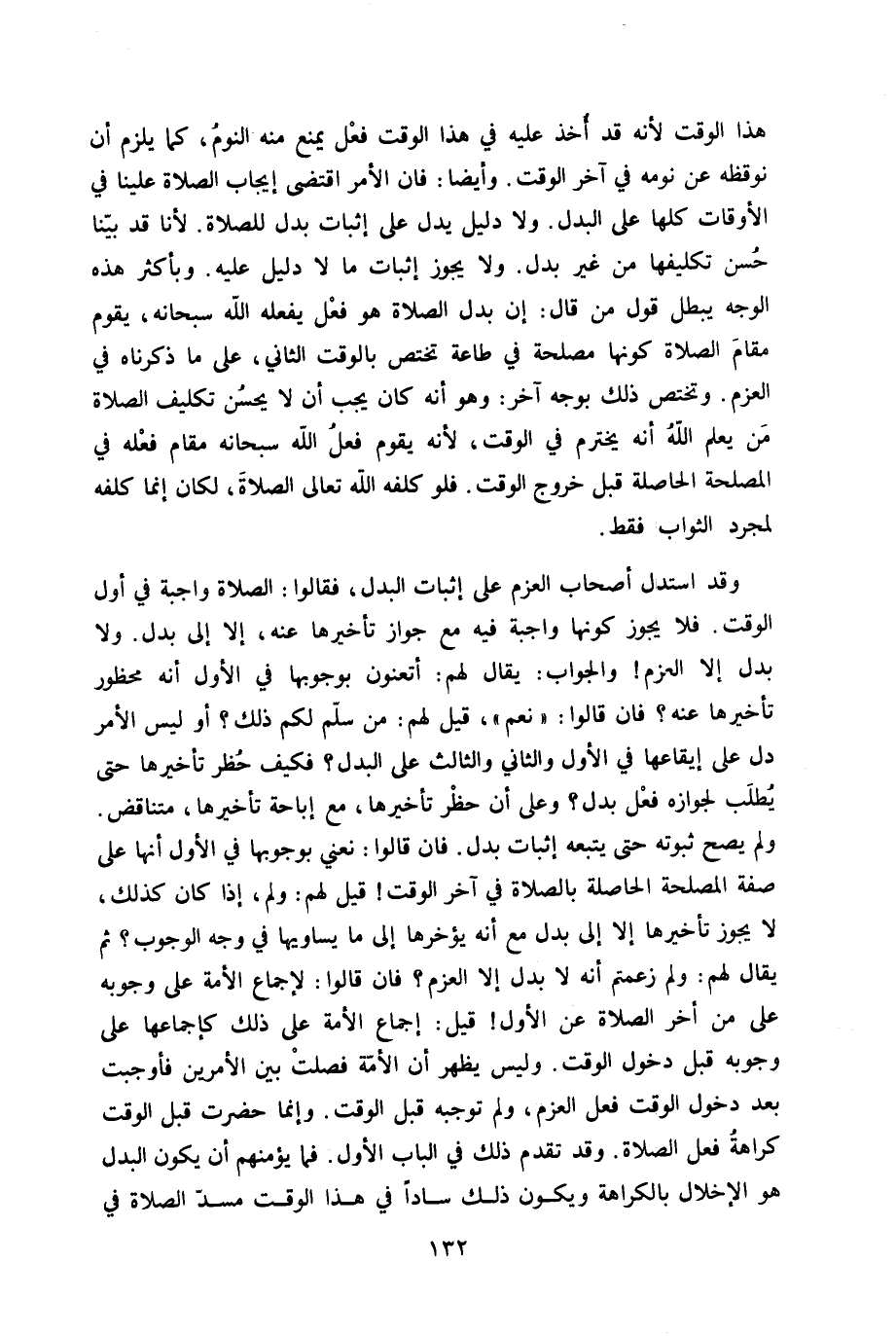وَقد اسْتدلَّ أَصْحَاب الْعَزْم على إِثْبَات الْبَدَل فَقَالُوا الصَّلَاة وَاجِبَة فِي أول الْوَقْت فَلَا يجوز كَونهَا وَاجِبَة فِيهِ مَعَ جَوَاز تَأْخِيرهَا عَنهُ إِلَّا إِلَى بدل وَلَا بدل إِلَّا الْعَزْم وَالْجَوَاب يُقَال لَهُم أتعنون بِوُجُوبِهَا فِي الأول أَنه مَحْظُور تَأْخِيرهَا عَنهُ فان قَالُوا نعم قيل لَهُم من سلم لكم ذَلِك أَو لَيْسَ الْأَمر دلّ على إيقاعها فِي الأول وَالثَّانِي وَالثَّالِث على الْبَدَل فَكيف حظر تَأْخِيرهَا حَتَّى يطْلب لجوازه فعل بدل وعَلى أَن حظر تَأْخِيرهَا مَعَ إِبَاحَة تَأْخِيرهَا متناقض وَلم يَصح ثُبُوته حَتَّى يتبعهُ إِثْبَات بدل فان قَالُوا نعني بِوُجُوبِهَا فِي الأول أَنَّهَا على صفة الْمصلحَة الْحَاصِلَة بِالصَّلَاةِ فِي آخر الْوَقْت قيل لَهُم وَلم إِذا كَانَ كَذَلِك لَا يجوز تَأْخِيرهَا إِلَّا إِلَى بدل مَعَ أَنه يؤخرها إِلَى مَا يساويها فِي وَجه الْوُجُوب ثمَّ يُقَال لَهُم وَلم زعمتم أَنه لَا بدل إِلَّا الْعَزْم فان قَالُوا لإِجْمَاع الْأمة على وُجُوبه على من أخر الصَّلَاة عَن الأول قيل إِجْمَاع الْأمة على ذَلِك كإجماعها على وُجُوبه قبل دُخُول الْوَقْت وَلَيْسَ يظْهر أَن الْأمة فصلت بَين الْأَمريْنِ فأوجبت بعد دُخُول الْوَقْت فعل الْعَزْم وَلم توجبه قبل الْوَقْت وَإِنَّمَا حضرت قبل الْوَقْت كَرَاهَة فعل الصَّلَاة وَقد تقدم ذَلِك فِي الْبَاب الأول فَمَا يؤمنهم أَن يكون الْبَدَل هُوَ الْإِخْلَال بِالْكَرَاهَةِ وَيكون ذَلِك سَادًّا فِي هَذَا الْوَقْت مسد الصَّلَاة فِي