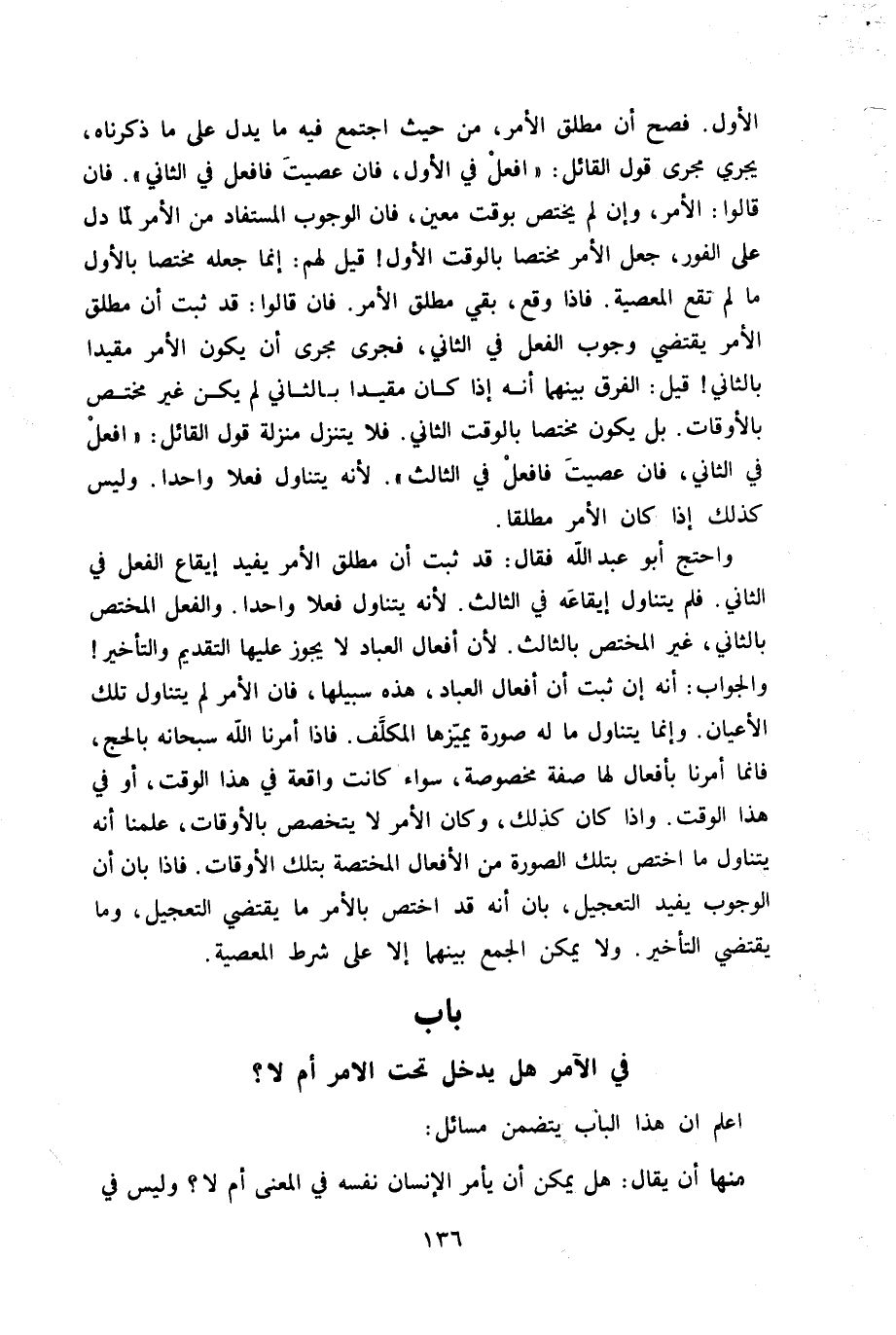 وَاحْتج أَبُو عبد الله فَقَالَ قد ثَبت أَن مُطلق الْأَمر يُفِيد إِيقَاع الْفِعْل فِي الثَّانِي فَلم يتَنَاوَل إِيقَاعه فِي الثَّالِث لِأَنَّهُ يتَنَاوَل فعلا وَاحِدًا وَالْفِعْل الْمُخْتَص بِالثَّانِي غير الْمُخْتَص بالثالث لِأَن أَفعَال الْعباد لَا يجوز عَلَيْهَا التَّقْدِيم وَالتَّأْخِير وَالْجَوَاب أَنه إِن ثَبت أَن أَفعَال الْعباد هَذِه سَبِيلهَا فان الْأَمر لم يتَنَاوَل تِلْكَ الْأَعْيَان وَإِنَّمَا يتَنَاوَل مَا لَهُ صُورَة يميزها الْمُكَلف فاذا أمرنَا الله سُبْحَانَهُ بِالْحَجِّ فانما أمرنَا بِأَفْعَال لَهَا صفة مَخْصُوصَة سَوَاء كَانَت وَاقعَة فِي هَذَا الْوَقْت أَو فِي هَذَا الْوَقْت واذا كَانَ كَذَلِك وَكَانَ الْأَمر لَا يتخصص بالأوقات علمنَا أَنه يتَنَاوَل مَا اخْتصَّ بِتِلْكَ الصُّورَة من الْأَفْعَال المختصة بِتِلْكَ الْأَوْقَات فاذا بَان أَن الْوُجُوب يُفِيد التَّعْجِيل بَان أَنه قد اخْتصَّ بِالْأَمر مَا يَقْتَضِي التَّعْجِيل وَمَا يَقْتَضِي التَّأْخِير وَلَا يُمكن الْجمع بَينهمَا إِلَّا على شَرط الْمعْصِيَة - صَلَّى اللَّهُ عَلَيْهِ وَسَلَّم َ - بَاب فِي الْآمِر هَل يدْخل تَحت الْأَمر ام لَا - صَلَّى اللَّهُ عَلَيْهِ وَسَلَّم َ -