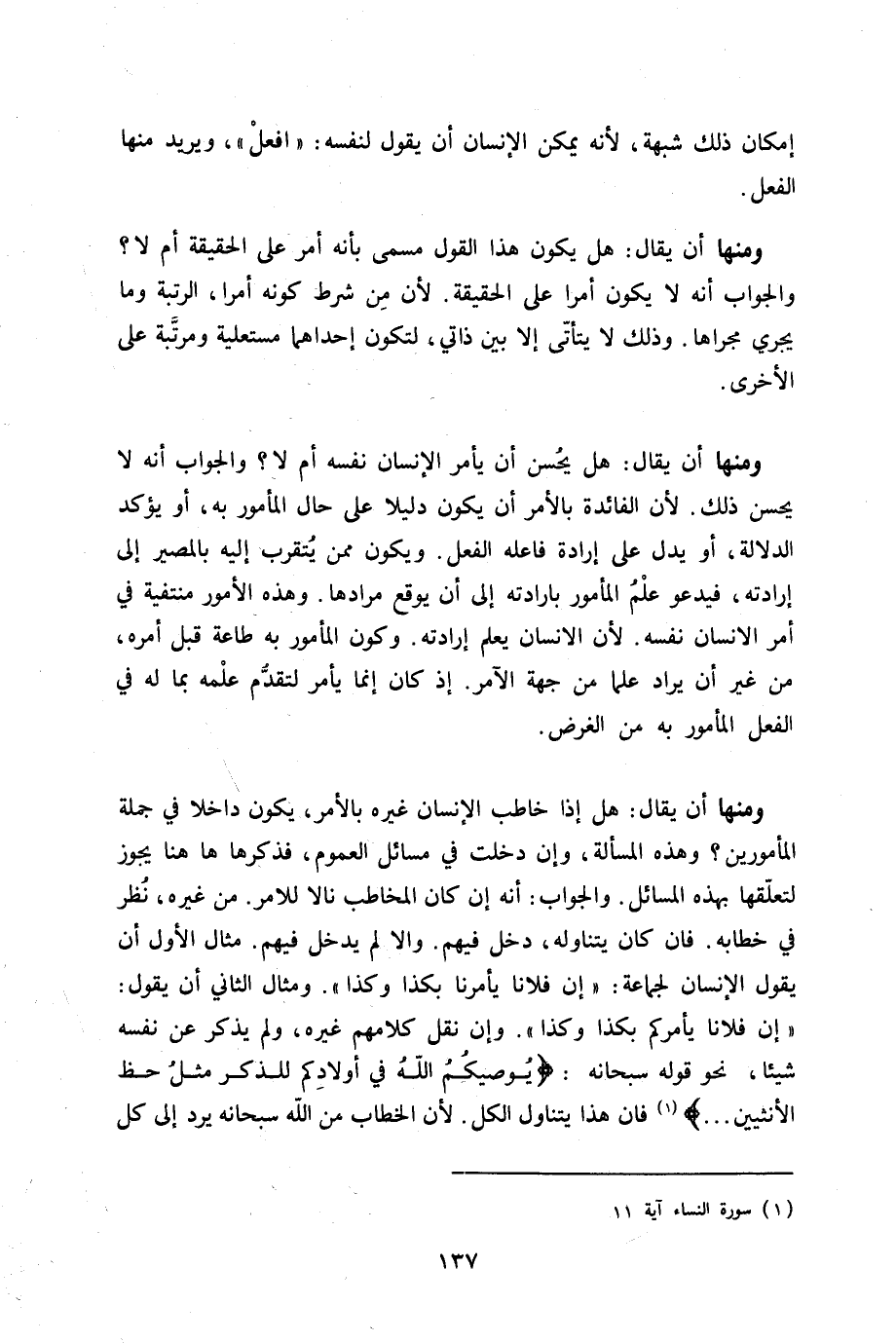 وَمِنْهَا أَن يُقَال هَل يحسن أَن يَأْمر الْإِنْسَان نَفسه أم لَا وَالْجَوَاب أَنه لَا يحسن ذَلِك لِأَن الْفَائِدَة بِالْأَمر أَن يكون دَلِيلا على حَال الْمَأْمُور بِهِ أَو يُؤَكد الدّلَالَة أَو يدل على إِرَادَة فَاعله الْفِعْل وَيكون مِمَّن يتَقرَّب إِلَيْهِ بالمصير إِلَى إِرَادَته فيدعو علم الْمَأْمُور بإرادته إِلَى أَن يُوقع مرادها وَهَذِه الْأُمُور منتفية فِي أَمر الْإِنْسَان نَفسه لِأَن الانسان يعلم إِرَادَته وَكَون الْمَأْمُور بِهِ طَاعَة قبل أمره من غير أَن يُرَاد علما من جِهَة الْآمِر إِذْ كَانَ إِنَّمَا يَأْمر لتقدم علمه بِمَا لَهُ فِي الْفِعْل الْمَأْمُور بِهِ من الْغَرَض