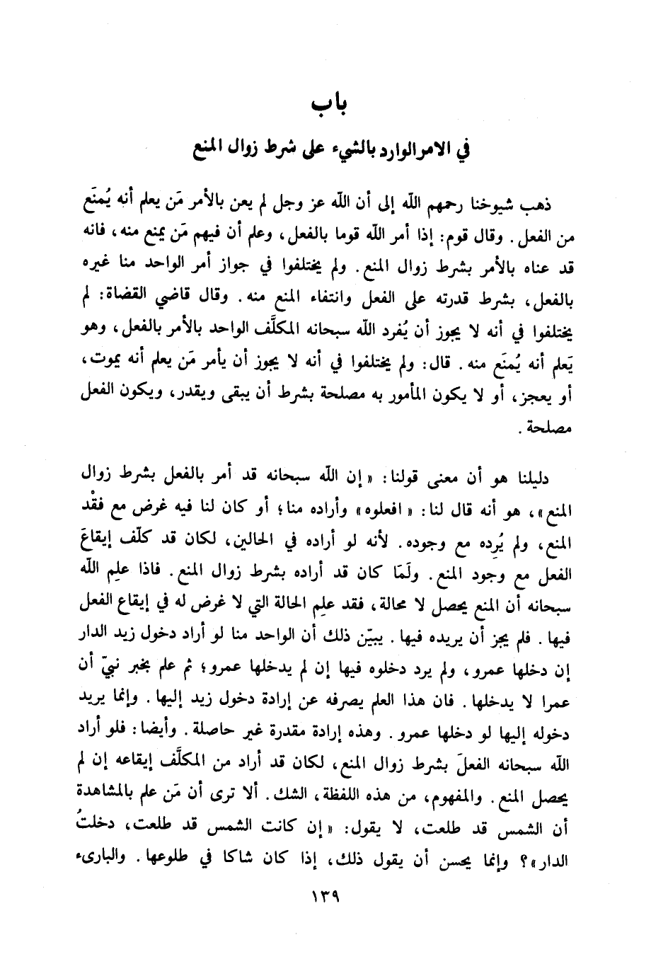 دليلنا هُوَ أَن معنى قَوْلنَا إِن الله سُبْحَانَهُ قد أَمر بِالْفِعْلِ بِشَرْط زَوَال الْمَنْع هُوَ أَنه قَالَ لنا افعلوه وأراده منا أَو كَانَ لنا فِيهِ غَرَض مَعَ فقد الْمَنْع وَلم يردهُ مَعَ وجوده لِأَنَّهُ لَو أَرَادَهُ فِي الْحَالين لَكَانَ قد كلف إِيقَاع الْفِعْل مَعَ وجود الْمَنْع وَلما كَانَ قد أَرَادَهُ بِشَرْط زَوَال الْمَنْع فاذا علم الله سُبْحَانَهُ أَن الْمَنْع يحصل لَا محَالة فقد علم الْحَالة الَّتِي لَا غَرَض لَهُ فِي إِيقَاع الْفِعْل فِيهَا فَلم يجز أَن يُريدهُ فِيهَا يبين ذَلِك أَن الْوَاحِد منا لَو أَرَادَ دُخُول زيد الدَّار إِن دَخلهَا عَمْرو وَلم يرد دَخَلُوهُ فِيهَا إِن لم يدخلهَا عَمْرو ثمَّ علم بِخَبَر نَبِي أَن عمرا لَا يدخلهَا فان هَذَا الْعلم يصرفهُ عَن إِرَادَة دُخُول زيد إِلَيْهَا وَإِنَّمَا يُرِيد دُخُوله إِلَيْهَا لَو دَخلهَا عَمْرو وَهَذِه إِرَادَة مقدرَة غير حَاصِلَة وَأَيْضًا فَلَو أَرَادَ الله سُبْحَانَهُ الْفِعْل بِشَرْط زَوَال الْمَنْع لَكَانَ قد اراد من الْمُكَلف إِيقَاعه إِن لم يحصل الْمَنْع وَالْمَفْهُوم من هَذِه اللَّفْظَة الشَّك أَلا ترى أَن من علم بِالْمُشَاهَدَةِ أَن الشَّمْس قد طلعت لَا يَقُول إِن كَانَت الشَّمْس قد طلعت دخلت الدَّار وَإِنَّمَا يحسن أَن يَقُول ذَلِك إِذا كَانَ شاكا فِي طُلُوعهَا والبارىء
