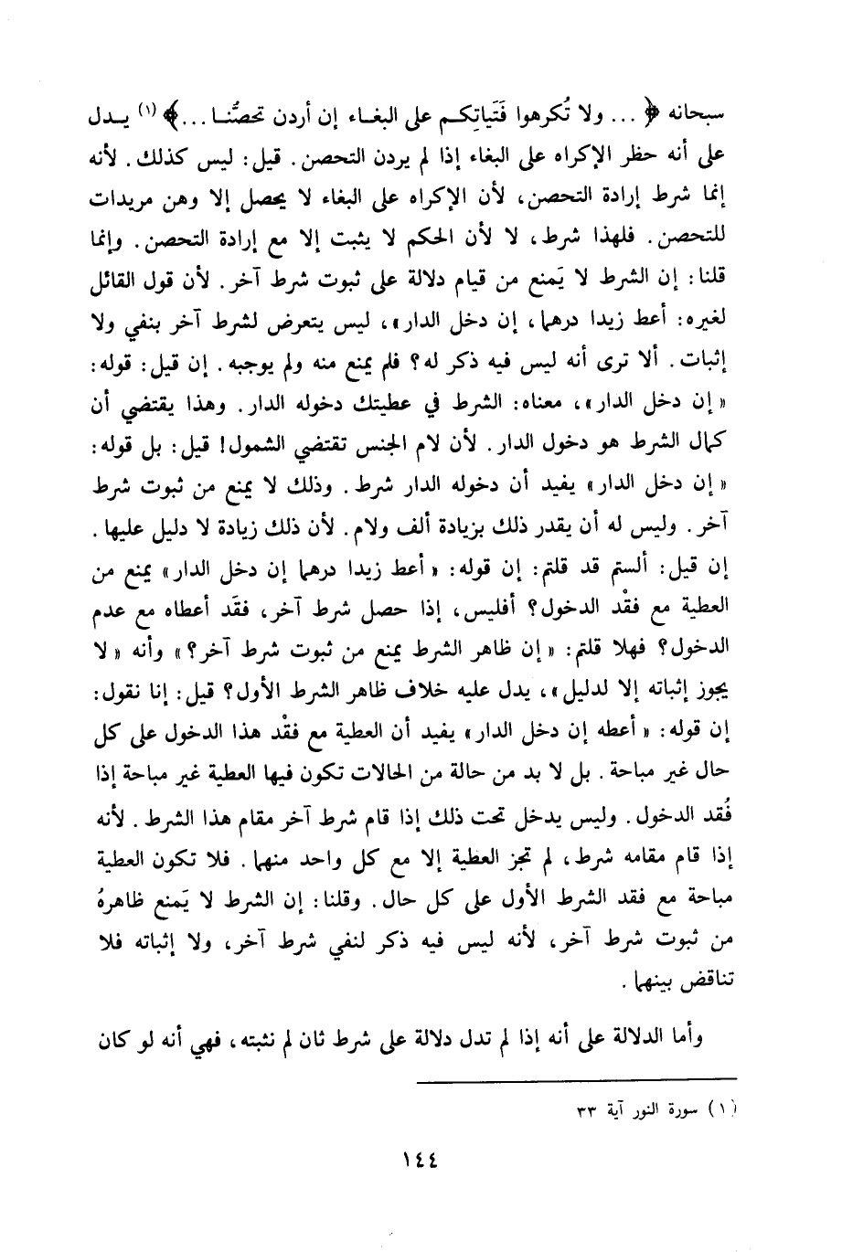 سُبْحَانَهُ {وَلَا تكْرهُوا فَتَيَاتكُم على الْبغاء إِن أردن تَحَصُّنًا} يدل على أَنه حظر الْإِكْرَاه على الْبغاء إِذا لم يردن التحصن قيل لَيْسَ كَذَلِك لِأَنَّهُ إِنَّمَا شَرط إِرَادَة التحصن لِأَن الْإِكْرَاه على الْبغاء لَا يحصل إِلَّا وَهن مريدات للتحصن فَلهَذَا شَرط لَا لِأَن الحكم لَا يثبت إِلَّا مَعَ إِرَادَة التحصن وَإِنَّمَا قُلْنَا إِن الشَّرْط لَا يمْنَع من قيام دلَالَة على ثُبُوت شَرط آخر لِأَن قَول الْقَائِل لغيره أعْط زيدا درهما إِن دخل الدَّار لَيْسَ يتَعَرَّض لشرط آخر بِنَفْي وَلَا إِثْبَات أَلا ترى أَنه لَيْسَ فِيهِ ذكر لَهُ فَلم يمْنَع مِنْهُ وَلم يُوجِبهُ إِن قيل قَوْله إِن دخل الدَّار مَعْنَاهُ الشَّرْط فِي عطيتك دُخُوله الدَّار وَهَذَا يَقْتَضِي أَن كَمَال الشَّرْط هُوَ دُخُول الدَّار لِأَن لَام الْجِنْس تَقْتَضِي الشُّمُول قيل بل قَوْله إِن دخل الدَّار يُفِيد أَن دُخُوله الدَّار شَرط وَذَلِكَ لَا يمْنَع من ثُبُوت شَرط آخر وَلَيْسَ لَهُ أَن يقدر ذَلِك بِزِيَادَة ألف وَلَام لِأَن ذَلِك زِيَادَة لَا دَلِيل عَلَيْهَا إِن قيل ألستم قد قُلْتُمْ إِن قَوْله أعْط زيدا درهما إِن دخل الدَّار يمْنَع من الْعَطِيَّة مَعَ فقد الدُّخُول أفليس إِذا حصل شَرط آخر فقد أعطَاهُ مَعَ عدم الدُّخُول فَهَلا قُلْتُمْ إِن ظَاهر الشَّرْط يمْنَع من ثُبُوت شَرط آخر وَأَنه لَا يجوز إثْبَاته إِلَّا لدَلِيل يدل عَلَيْهِ خلاف ظَاهر الشَّرْط الأول قيل إِنَّا نقُول إِن قَوْله أعْطه إِن دخل الدَّار يُفِيد أَن الْعَطِيَّة مَعَ فقد هَذَا الدُّخُول على كل حَال غير مُبَاحَة بل لَا بُد من حَالَة من الْحَالَات تكون فِيهَا الْعَطِيَّة غير مُبَاحَة إِذا فقد الدُّخُول وَلَيْسَ يدْخل تَحت ذَلِك إِذا قَامَ شَرط آخر مقَام هَذَا الشَّرْط لِأَنَّهُ إِذا قَامَ مقَامه شَرط لم تجز الْعَطِيَّة إِلَّا مَعَ كل وَاحِد مِنْهُمَا فَلَا تكون الْعَطِيَّة مُبَاحَة مَعَ فقد الشَّرْط الأول على كل حَال وَقُلْنَا إِن الشَّرْط لَا يمْنَع ظَاهِرَة من ثُبُوت شَرط آخر لِأَنَّهُ لَيْسَ فِيهِ ذكر لنفي شَرط آخر وَلَا إثْبَاته فَلَا تنَاقض بَينهمَا