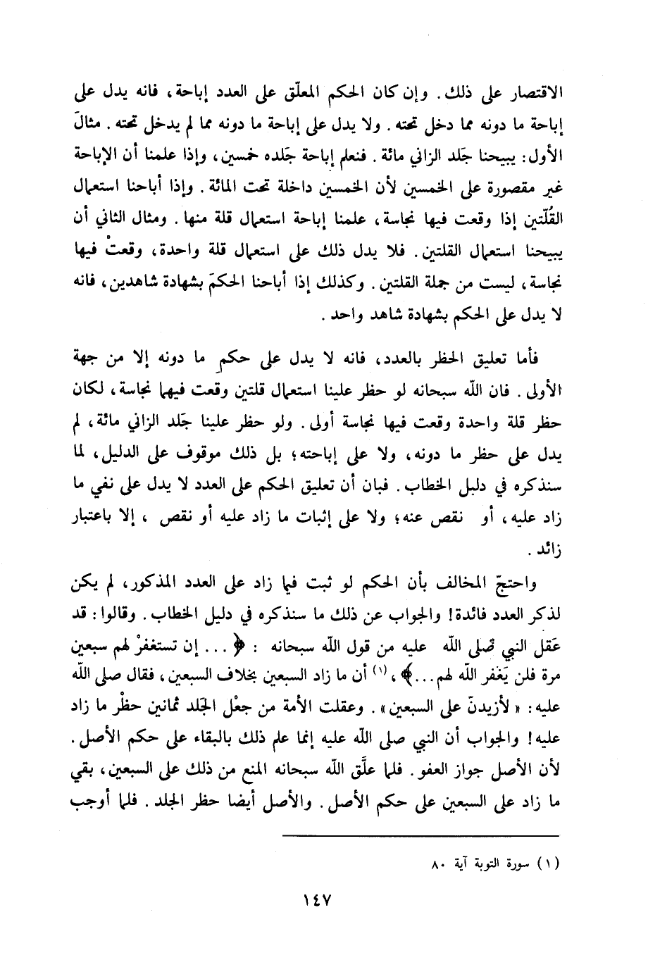 فَأَما تَعْلِيق الْحَظْر بِالْعدَدِ فانه لَا يدل على حكم مَا دونه إِلَّا من جِهَة الأولى فان الله سُبْحَانَهُ لَو حظر علينا اسْتِعْمَال قُلَّتَيْنِ وَقعت فيهمَا نَجَاسَة لَكَانَ حظر قلَّة وَاحِدَة وَقعت فِيهَا نَجَاسَة أولى وَلَو حظر علينا جلد الزَّانِي مائَة لم يدل على حظر مَا دونه وَلَا على إِبَاحَته بل ذَلِك مَوْقُوف على الدَّلِيل لما سَنذكرُهُ فِي دَلِيل الْخطاب فَبَان أَن تَعْلِيق الحكم على الْعدَد لَا يدل على نفي مَا زَاد عَلَيْهِ أَو نقص عَنهُ وَلَا على إِثْبَات مَا زَاد عَلَيْهِ أَو نقص إِلَّا بِاعْتِبَار زَائِد