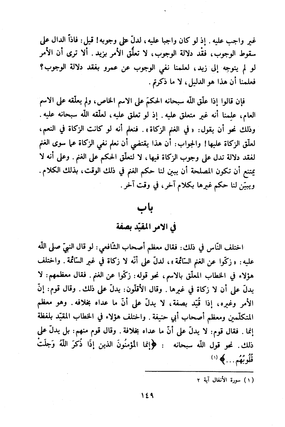 فَإِن قَالُوا إِذا علق الله سُبْحَانَهُ الحكم على الِاسْم الْخَاص وَلم يعلقه على الِاسْم الْعَام علمنَا أَنه غير مُتَعَلق عَلَيْهِ إِذْ لَو تعلق عَلَيْهِ لعلقه الله سُبْحَانَهُ عَلَيْهِ وَذَلِكَ نَحْو أَن يَقُول فِي الْغنم الزَّكَاة فنعلم أَنه لَو كَانَت الزَّكَاة فِي النعم لعلق الزَّكَاة عَلَيْهَا وَالْجَوَاب أَن هَذَا يَقْتَضِي أَن نعلم نفي الزَّكَاة عَمَّا سوى الْغنم لفقد دلَالَة تدل على وجوب الزَّكَاة فِيهَا لَا لتَعلق الحكم على الْغنم وعَلى أَنه لَا يمْتَنع أَن تكون الْمصلحَة أَن يبين لنا حكم الْغنم فِي ذَلِك الْوَقْت بذلك الْكَلَام وَيبين لنا حكم غَيرهَا بِكَلَام آخر فِي وَقت آخر - صَلَّى اللَّهُ عَلَيْهِ وَسَلَّم َ - بَاب فِي الامر الْمُقَيد بِصفة - صَلَّى اللَّهُ عَلَيْهِ وَسَلَّم َ -
