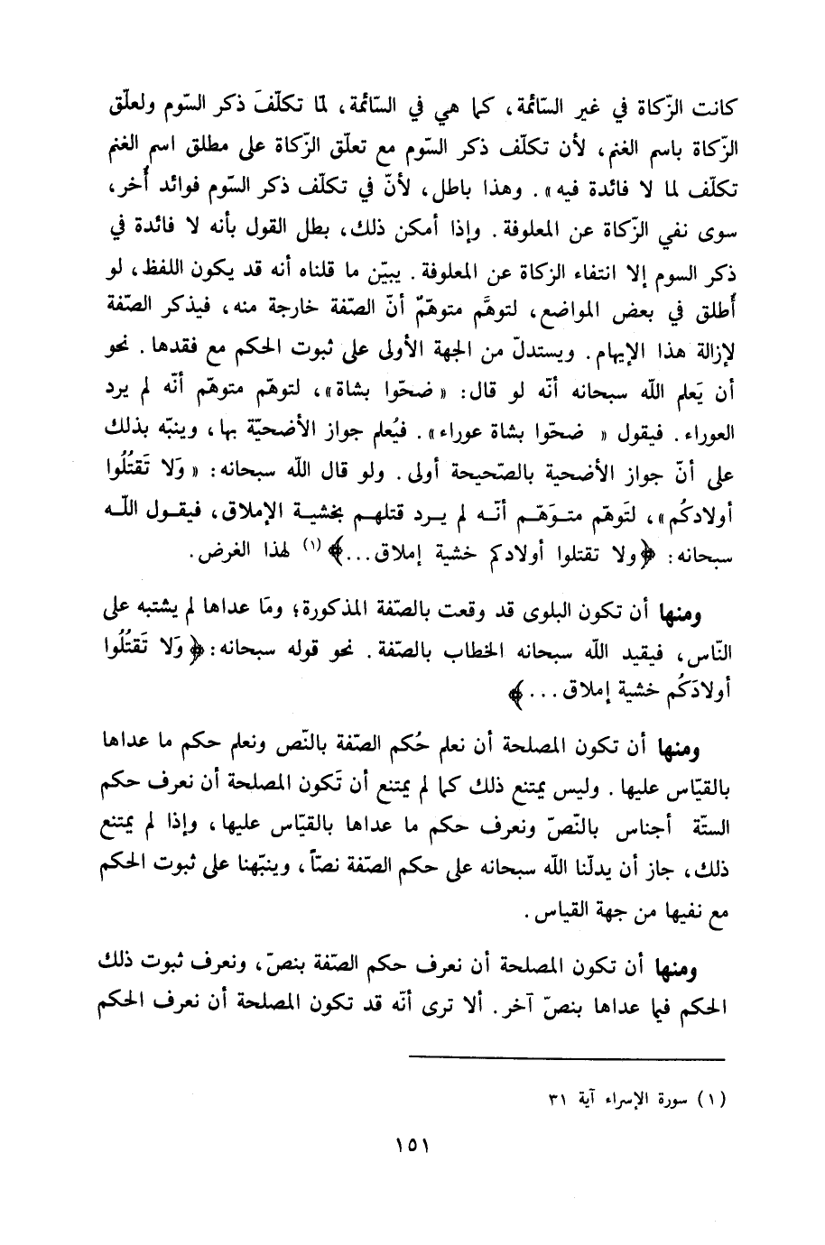 كَانَت الزَّكَاة فِي غير السَّائِمَة كَمَا هِيَ فِي السَّائِمَة لما تكلّف ذكر السّوم ولعلق الزَّكَاة باسم الْغنم لِأَن تكلّف ذكر السّوم مَعَ تعلق الزَّكَاة على مُطلق اسْم الْغنم تكلّف لما لَا فَائِدَة فِيهِ وَهَذَا بَاطِل لِأَن فِي تكلّف ذكر السّوم فَوَائِد أخر سوى نفي الزَّكَاة عَن المعلوفة وَإِذا أمكن ذَلِك بَطل القَوْل بِأَنَّهُ لَا فَائِدَة فِي ذكر السّوم إِلَّا انْتِفَاء الزَّكَاة عَن المعلوفة يبين مَا قُلْنَاهُ أَنه قد يكون اللَّفْظ لَو أطلق فِي بعض الْمَوَاضِع لتوهم متوهم أَن الصّفة خَارِجَة مِنْهُ فيذكر الصّفة لإِزَالَة هَذَا الْإِيهَام ويستدل من الْجِهَة الأولى على ثُبُوت الحكم مَعَ فقدها نَحْو أَن يعلم الله سُبْحَانَهُ أَنه لَو قَالَ ضحوا بِشَاة لتوهم متوهم أَنه لم يرد العوراء فَيَقُول ضحوا بِشَاة عوراء فَيعلم جَوَاز الْأُضْحِية بهَا وينبه بذلك على أَن جَوَاز الْأُضْحِية بالصحيحة أولى وَلَو قَالَ الله سُبْحَانَهُ {وَلَا تقتلُوا أَوْلَادكُم} لتوهم متوهم أَنه لم يرد قَتلهمْ بخشية الإملاق فَيَقُول الله سُبْحَانَهُ {وَلَا تقتلُوا أَوْلَادكُم خشيَة إملاق} لهَذَا الْغَرَض