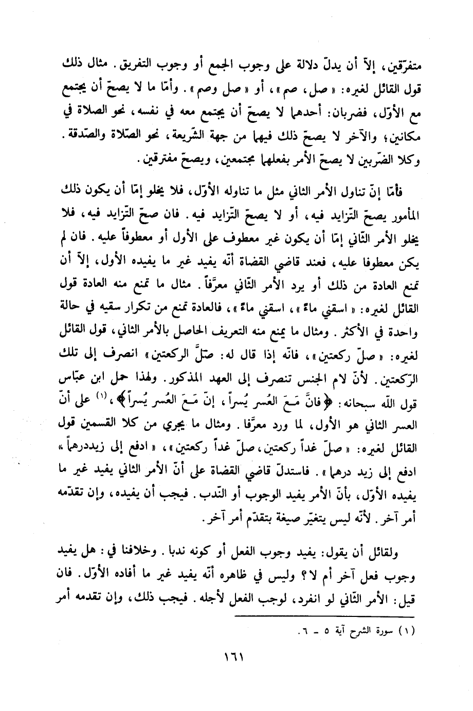 مُتَفَرّقين إِلَّا أَن يدل دلَالَة على وجوب الْجمع أَو وجوب التَّفْرِيق مِثَال ذَلِك قَول الْقَائِل لغيره صل صم أَو صل وصم وَأما مَا لايصح أَن يجْتَمع مَعَ الأول فضربان أَحدهمَا لَا يَصح أَن يجْتَمع مَعَه فِي نَفسه نَحْو الصَّلَاة فِي مكانين وَالْآخر لَا يَصح ذَلِك فيهمَا من جِهَة الشَّرِيعَة نَحْو الصَّلَاة وَالصَّدَََقَة وكلا الضربين لَا يَصح الْأَمر بفعلهما مُجْتَمعين وَيصِح مفترقين