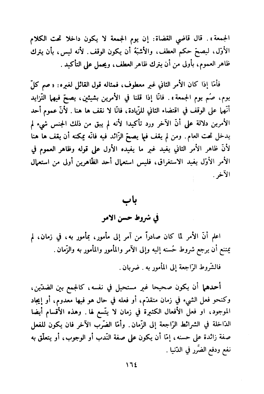 فَأَما إِذا كَانَ الْأَمر الثَّانِي غير مَعْطُوف فمثاله قَول الْقَائِل لغيره صم كل يَوْم صم يَوْم الْجُمُعَة فانا إِذا قُلْنَا فِي الْأَمريْنِ بشيئين يَصح فيهمَا التزايد أَنَّهُمَا على الْوَقْف فِي اقْتِضَاء الثَّانِي للزِّيَادَة فانا لَا نقف هَا هُنَا لِأَن عُمُوم أحد الْأَمريْنِ دلَالَة على أَن الآخر ورد تَأْكِيدًا لِأَنَّهُ لم يبْق من ذَلِك الْجِنْس شَيْء لم يدْخل تَحت الْعَام وَمن لم يقف فِيمَا يَصح الزَّائِد فِيهِ فانه يُمكنهُ أَن يقف هَا هُنَا لِأَن ظَاهر الْأَمر الثَّانِي يُفِيد غير مَا يفِيدهُ الأول على قَوْله وَظَاهر الْعُمُوم فِي الْأَمر الأول يُفِيد الِاسْتِغْرَاق فَلَيْسَ اسْتِعْمَال اُحْدُ الظاهرين أولى من اسْتِعْمَال الآخر - صَلَّى اللَّهُ عَلَيْهِ وَسَلَّم َ - بَاب فِي فِي شُرُوط حسن الامر - صَلَّى اللَّهُ عَلَيْهِ وَسَلَّم َ -