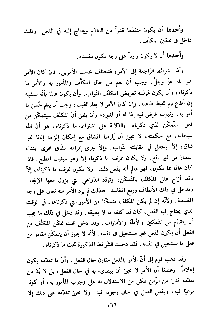 وأحدها أَن يكون مُتَقَدما قدرا من التَّقَدُّم وَيحْتَاج إِلَيْهِ فِي الْفِعْل وَذَلِكَ دَاخل فِي تَمْكِين الْمُكَلف