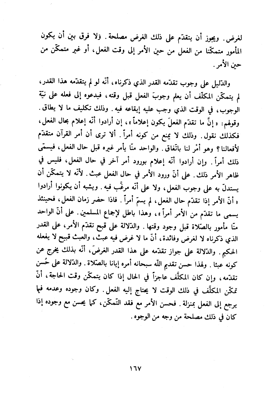 وَالدَّلِيل على وجوب تقدمه الْقدر الَّذِي ذَكرْنَاهُ أَنه لَو لم يتقدمه هَذَا الْقدر لم يتَمَكَّن الْمُكَلف أَن يعلم وجوب الْفِعْل قبل وقته فيدعوه إِلَى فعله على نِيَّة الْوُجُوب فِي الْوَقْت الَّذِي وَجب عَلَيْهِ إِيقَاعه فِيهِ وَذَلِكَ تَكْلِيف مَا لَا يُطَاق وَقَوْلهمْ إِن مَا تقدم الْفِعْل يكون إعلاما إِن أَرَادوا أَنه إِعْلَام بِحَال الْفِعْل فَكَذَلِك نقُول وَذَلِكَ لَا يمْنَع من كَونه أمرا أَلا ترى أَن أَمر الْقُرْآن مُتَقَدم لأفعالنا وَهُوَ أَمر لنا بِاتِّفَاق وَالْوَاحد منا يَأْمر غَيره قبل حَال الْفِعْل فيسمى ذَلِك أمرا وَإِن أَرَادوا أَنه إِعْلَام بورود أَمر آخر فِي حَال الْفِعْل فَلَيْسَ فِي ظَاهر الْأَمر ذَلِك على أَن وُرُود الْأَمر فِي حَال الْفِعْل عَبث لِأَنَّهُ لَا يتَمَكَّن أَن يسْتَدلّ بِهِ على وجوب الْفِعْل وَلَا على أَنه مرغب فِيهِ وَيُشبه أَن يَكُونُوا أَرَادوا أَن الْأَمر إِذا تقدم حَال الْفِعْل لم يسم أمرا فاذا حضر زمَان الْفِعْل فَحِينَئِذٍ يُسمى مَا تقدم من الْأَمر أمرا وَهَذَا بَاطِل لإِجْمَاع الْمُسلمين على أَن الْوَاحِد منا مَأْمُور بِالصَّلَاةِ قبل وجود وَقتهَا وَالدّلَالَة على قبح تقدم الْأَمر على الْقدر الَّذِي ذَكرْنَاهُ لَا لغَرَض وَفَائِدَة أَن مَا لَا غَرَض فِيهِ عَبث والعبث قَبِيح لَا يَفْعَله الْحَكِيم وَالدّلَالَة على جَوَاز تقدمه على هَذَا الْقدر الْغَرَض أَنه بذلك يخرج عَن كَونه عَبَثا وَلِهَذَا حسن تَقْدِيم الله سُبْحَانَهُ أمره إيانا بِالصَّلَاةِ وَالدّلَالَة على حسن تقدمه وَإِن كَانَ الْمُكَلف عَاجِزا فِي الْحَال إِذا كَانَ يتَمَكَّن وَقت الْحَاجة أَن تمكن الْمُكَلف فِي ذَلِك الْوَقْت لَا يحْتَاج إِلَيْهِ الْفِعْل وَكَانَ وجوده وَعَدَمه فِيمَا يرجع إِلَى الْفِعْل بِمَنْزِلَة فَحسن الْأَمر مَعَ فقد التَّمَكُّن كَمَا يسحن مَعَ وجوده إِذا كَانَ فِي ذَلِك مصلحَة من وَجه من الْوُجُوه