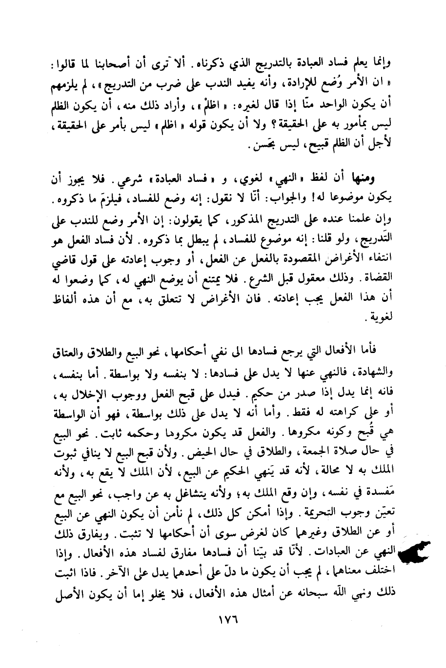 فَأَما الْأَفْعَال الَّتِي يرجع فَسَادهَا إِلَى نفي أَحْكَامهَا نَحْو البيع وَالطَّلَاق وَالْعتاق وَالشَّهَادَة فالنهي عَنْهَا لَا يدل على فَسَادهَا لَا بِنَفسِهِ وَلَا بِوَاسِطَة أما بِنَفسِهِ فانه إِنَّمَا يدل إِذا صدر من حَكِيم فَيدل على قبح الْفِعْل وَوُجُوب الْإِخْلَال بِهِ أَو على كَرَاهَته لَهُ فَقَط وَأما أَنه لَا يدل على ذَلِك بِوَاسِطَة فَهُوَ أَن الْوَاسِطَة هِيَ قبح وَكَونه مَكْرُوها وَالْفِعْل قد يكون مَكْرُوها وَحكمه ثَابت نَحْو البيع فِي حَال صَلَاة الْجُمُعَة وَالطَّلَاق فِي حَال الْحيض وَلِأَن قبح البيع لَا يُنَافِي ثُبُوت الْملك بِهِ لَا محَالة لِأَنَّهُ قد يُنْهِي الْحَكِيم عَن البيع لِأَن الْملك لَا يَقع بِهِ وَلِأَنَّهُ مفْسدَة فِي نَفسه وَإِن وَقع الْملك بِهِ وَلِأَنَّهُ يتشاغل بِهِ عَن وَاجِب نَحْو البيع مَعَ تعين وجوب التَّحْرِيمَة وَإِذا أمكن كل ذَلِك لم نَأْمَن أَن يكون النَّهْي عَن البيع أَو عَن الطَّلَاق وَغَيرهمَا كَانَ لغَرَض سوى أَن أَحْكَامهَا لَا تثبت وَيُفَارق ذَلِك النَّهْي عَن الْعِبَادَات لأَنا قد بَينا أَن فَسَادهَا مفارق لفساد هَذِه الْأَفْعَال وَإِذا اخْتلف مَعْنَاهُمَا لم يجب أَن يكون مَا دلّ على أَحدهمَا يدل على الآخر فاذا اثْبتْ ذَلِك وَنهي الله سُبْحَانَهُ عَن أَمْثَال هَذِه الْأَفْعَال فَلَا يَخْلُو إِمَّا أَن يكون الأَصْل