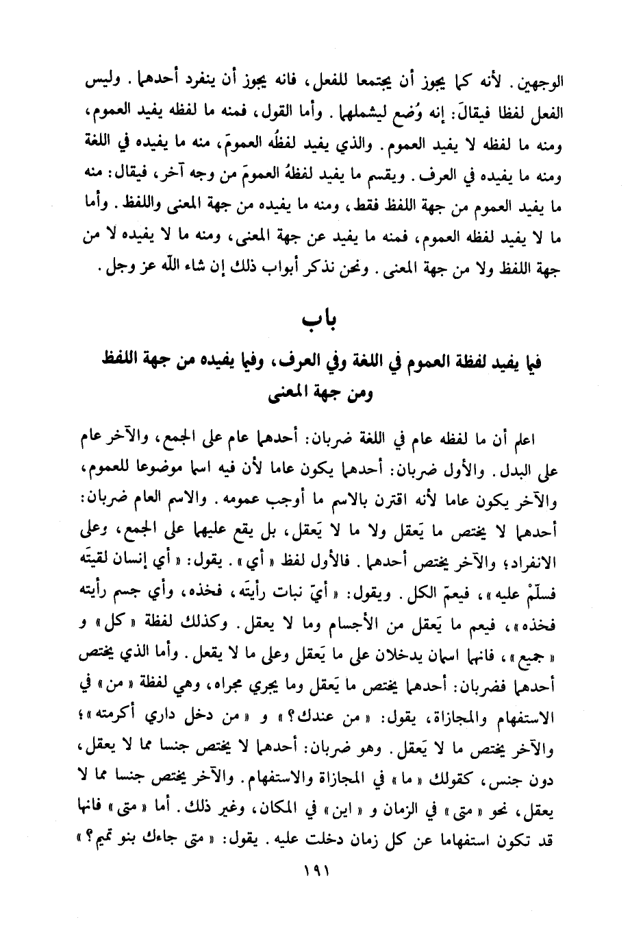 اعْلَم أَن مَا لَفظه عَام فِي اللُّغَة ضَرْبَان أَحدهمَا عَام على الْجمع وَالْآخر عَام على الْبَدَل وَالْأول ضَرْبَان أَحدهمَا يكون عَاما لِأَن فِيهِ اسْما مَوْضُوعا للْعُمُوم وَالْآخر يكون عَاما لِأَنَّهُ اقْترن بِالِاسْمِ مَا أوجب عُمُومه وَالِاسْم الْعَام ضَرْبَان أَحدهمَا لَا يخْتَص مَا يعقل وَلَا مَا لَا يعقل بل يَقع عَلَيْهِمَا على الْجمع وعَلى الِانْفِرَاد وَالْآخر يخْتَص أَحدهمَا فَالْأول لفظ أَي يَقُول أَي إِنْسَان لَقيته فَسلم عَلَيْهِ فَيعم الْكل وَيَقُول أَي نَبَات رَأَيْته فَخذه وَأي جسم رَأَيْته فَخذه فَيعم مَا يعقل من الْأَجْسَام وَمَا لَا يعقل وَكَذَلِكَ لَفْظَة كل وَجَمِيع فانهما اسمان يدخلَانِ على مَا يعقل وعَلى مَا لَا يعقل وَأما الَّذِي يخْتَص أَحدهمَا فضربان أَحدهمَا يخْتَص مَا يعقل وَمَا يجْرِي مجْرَاه وَهِي لَفْظَة من فِي الاسفهام والمجازاة يَقُول من عنْدك وَمن دخل دَاري أكرمته وَالْآخر يخْتَص مَا لَا يعقل وَهُوَ ضَرْبَان أَحدهمَا لَا يخْتَص جِنْسا مِمَّا لَا يعقل دون جنس كَقَوْلِك مَا فِي المجازاة والاستفهام وَالْآخر يخْتَص جِنْسا مِمَّا لَا يعقل نَحْو مَتى فِي الزَّمَان واين فِي الْمَكَان وَغير ذَلِك أما مَتى فانها قد تكون استفهاما عَن كل زمَان دخلت عَلَيْهِ يَقُول مَتى جَاءَك بَنو تَمِيم