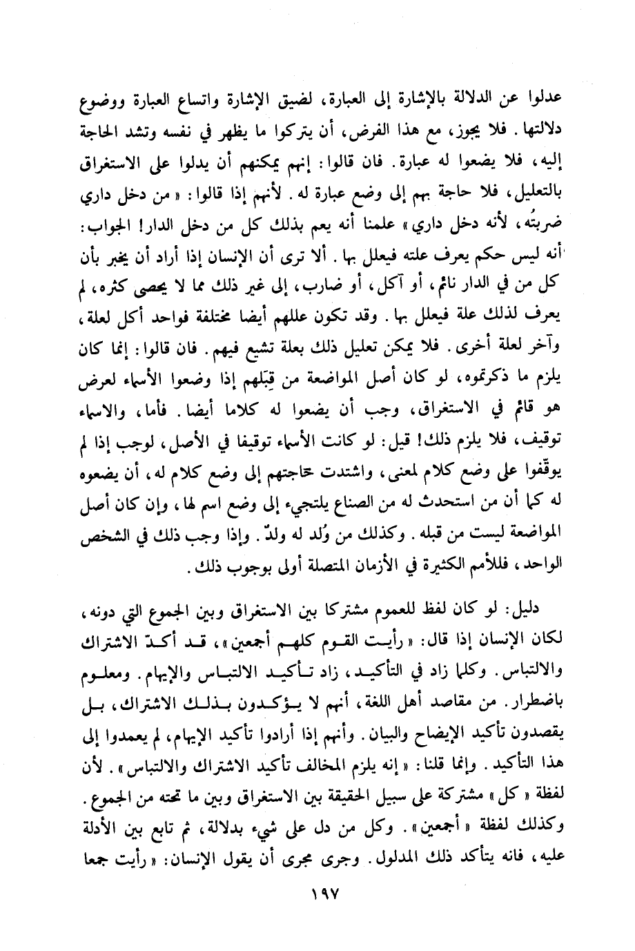دَلِيل لَو كَانَ لفظ للْعُمُوم مُشْتَركا بَين الِاسْتِغْرَاق وَبَين الجموع الَّتِي دونه لَكَانَ الْإِنْسَان إِذا قَالَ رَأَيْت الْقَوْم كلهم أَجْمَعِينَ قد أكد الِاشْتِرَاك والالتباس وَكلما زَاد فِي التَّأْكِيد زَاد تَأْكِيد الالتباس وَالْإِيهَام وَمَعْلُوم باضطرار من مَقَاصِد أهل اللُّغَة أَنهم لَا يؤكدون بذلك الِاشْتِرَاك بل يقصدون تَأْكِيد الْإِيضَاح وَالْبَيَان وَأَنَّهُمْ إِذا أَرَادوا تَأْكِيد الْإِيهَام لم يعمدوا إِلَى هَذَا التَّأْكِيد وَإِنَّمَا قُلْنَا إِنَّه يلْزم الْمُخَالف تَأْكِيد الِاشْتِرَاك والالتباس لِأَن لَفْظَة كل مُشْتَركَة على سَبِيل الْحَقِيقَة بَين الِاسْتِغْرَاق وَبَين مَا تَحْتَهُ من الجموع وَكَذَلِكَ لَفْظَة أَجْمَعِينَ وكل من دلّ على شَيْء بِدلَالَة ثمَّ تَابع بَين الْأَدِلَّة عَلَيْهِ فانه يتَأَكَّد ذَلِك الْمَدْلُول وَجرى مجْرى أَن يَقُول الْإِنْسَان رَأَيْت جمعا