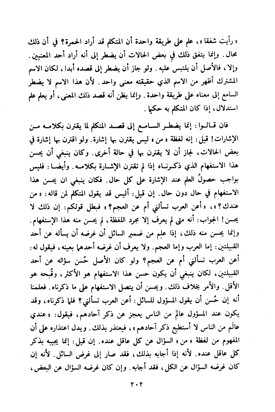 رَأَيْت شفقا علم على طَريقَة وَاحِدَة أَن الْمُتَكَلّم قد أَرَادَ الْحمرَة فِي أَن ذَلِك محَال وَإِنَّمَا يتَّفق ذَلِك فِي بعض الْحَالَات أَن يضْطَر إِلَى أَنه أَرَادَ أحد الْمَعْنيين وَإِلَّا فَالْأَصْل أَن يلتبس عَلَيْهِ وَلَو جَازَ أَن يضْطَر إِلَى قَصده أبدا لَكَانَ الِاسْم الْمُشْتَرك أظهر من الِاسْم الَّذِي حَقِيقَته معنى وَاحِد لِأَن هَذَا الِاسْم لَا يضْطَر السَّامع إِلَى مَعْنَاهُ على طَريقَة وَاحِدَة وَإِنَّمَا يظنّ أَنه قصد ذَلِك الْمَعْنى أَو يعلم علم اسْتِدْلَال إِذا كَانَ الْمُتَكَلّم بِهِ حكيما