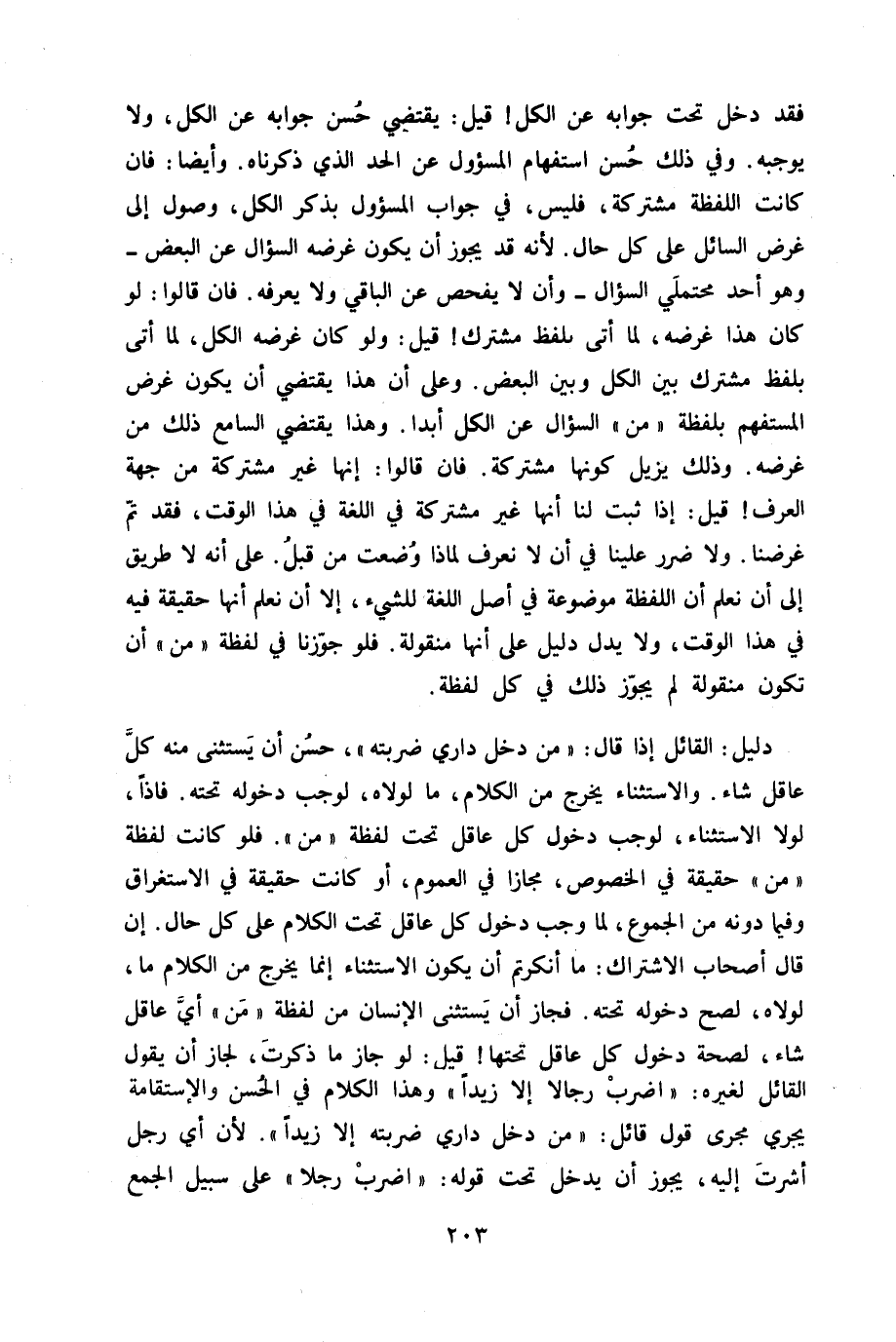 دَلِيل الْقَائِل إِذا قَالَ من دخل دَاري ضَربته حسن أَن يسْتَثْنى مِنْهُ كل عَاقل وَالِاسْتِثْنَاء يخرج من الْكَلَام مَا لولاه لوَجَبَ دُخُوله تَحْتَهُ فاذا لَوْلَا الِاسْتِثْنَاء لوَجَبَ دُخُول كل عَاقل تَحت لَفْظَة من فَلَو كَانَت لَفْظَة من حَقِيقَة فِي الْخُصُوص مجَازًا فِي الْعُمُوم أَو كَانَت حَقِيقَة فِي الِاسْتِغْرَاق وَفِيمَا دونه من الجموع لما وَجب دُخُول كل عَاقل تَحت الْكَلَام على كل حَال إِن قَالَ أَصْحَاب الِاشْتِرَاك مَا أنكرتم أَن يكون الِاسْتِثْنَاء إِنَّمَا يخرج من الْكَلَام مَا لولاه لصَحَّ دُخُوله تَحْتَهُ فَجَاز أَن يسْتَثْنى الْإِنْسَان من لَفْظَة من أَي عَاقل شَاءَ لصحه دُخُول كل عَاقل تحتهَا قيل لَو جَازَ مَا ذكرت لجَاز أَن يَقُول الْقَائِل لغيره اضْرِب رجَالًا إِلَّا زيدا وَهَذَا الْكَلَام فِي الْحسن والإستقامة يجْرِي مجْرى قَول قَائِل من دخل دَاري ضَربته إِلَّا زيدا لِأَن أَي رجل أَشرت إِلَيْهِ يجوز أَن يدْخل تَحت قَوْله اضْرِب رجلا على سَبِيل الْجمع