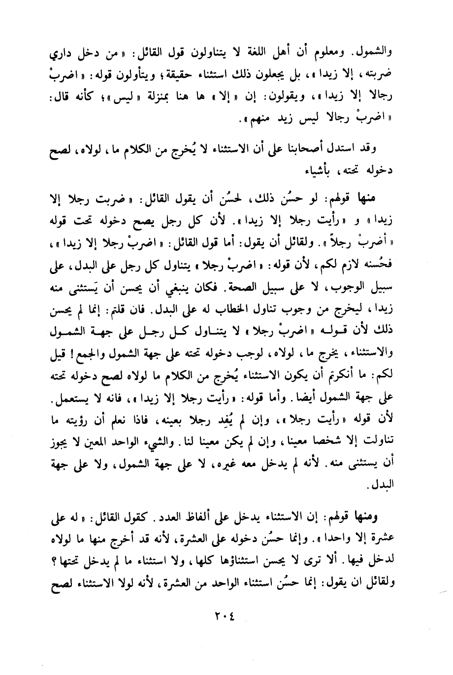 مِنْهَا قَوْلهم لَو حسن ذَلِك لحسن أَن يَقُول الْقَائِل ضربت رجلا إِلَّا زيدا وَرَأَيْت رجلا إِلَّا زيدا لِأَن كل رجل يَصح دُخُوله تَحت قَوْله أضْرب رجلا وَلقَائِل أَن يَقُول أما قَول الْقَائِل اضْرِب رجلا إِلَّا زيدا فحسنه لَازم لكم لِأَن قَوْله اضْرِب رجلا يتَنَاوَل كل رجل على الْبَدَل على سَبِيل الْوُجُوب لَا على سَبِيل الصِّحَّة فَكَانَ يَنْبَغِي أَن يحسن أَن يسْتَثْنى مِنْهُ زيدا ليخرج من وجوب تنَاول الْخطاب لَهُ على الْبَدَل فان قُلْتُمْ إِنَّمَا لم يحسن ذَلِك لِأَن قَوْله اضْرِب رجلا لَا يتَنَاوَل كل رجل على جِهَة الشُّمُول وَالِاسْتِثْنَاء يخرج مَا لولاه لوَجَبَ دُخُوله تَحْتَهُ على جِهَة الشُّمُول الْجمع قبل لكم مَا أنكرتم أَن يكون الِاسْتِثْنَاء يخرج من الْكَلَام مَا لولاه لصَحَّ دُخُوله تَحْتَهُ على جِهَة الشُّمُول أَيْضا وَأما قَوْله رَأَيْت رجلا إِلَّا زيدا فانه لَا يسْتَعْمل لِأَن قَوْله رَأَيْت رجلا وَإِن لم يفد رجلا بِعَيْنِه فاذا نعلم أَن رُؤْيَته مَا تناولت إِلَّا شخصا معينا وَإِن لم يكن معينا لنا وَالشَّيْء الْوَاحِد الْمعِين لَا يجوز أَن يسْتَثْنى مِنْهُ لِأَنَّهُ لم يدْخل مَعَه غَيره لَا على جِهَة الشُّمُول وَلَا على جِهَة الْبَدَل