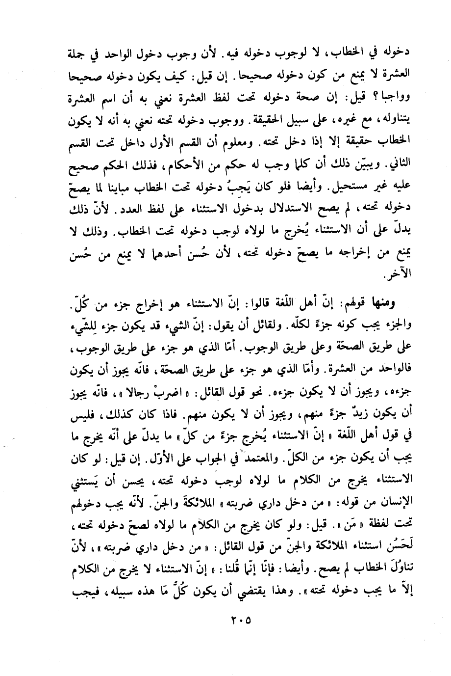 وَمِنْهَا قَوْلهم إِن أهل اللُّغَة قَالُوا إِن الِاسْتِثْنَاء هُوَ إِخْرَاج جُزْء من كل والجزء يجب كَونه جُزْء لكله وَلقَائِل أَن يَقُول إِن الشَّيْء قد يكون جُزْء للشَّيْء على طَرِيق الصِّحَّة وعَلى طَرِيق الْوُجُوب أما الَّذِي هُوَ جُزْء على طَرِيق الْوُجُوب فالواحد من الْعشْرَة وَأما الَّذِي هُوَ جُزْء على طَرِيق الصِّحَّة فانه يجوز أَن يكون جزءه وَيجوز أَن لَا يكون جزءه نَحْو قَول الْقَائِل اضْرِب رجَالًا فانه يجوز أَن يكون زيد جُزْء مِنْهُم وَيجوز أَن لَا يكون مِنْهُم فاذا كَانَ كَذَلِك فَلَيْسَ فِي قَول أهل اللُّغَة إِن الِاسْتِثْنَاء يخرج جُزْء من كل مَا يدل على أَنه يخرج مَا يجب أَن يكون جُزْء من الْكل وَالْمُعْتَمد فِي الْجَواب على الأول إِن قيل لَو كَانَ الِاسْتِثْنَاء يخرج من الْكَلَام مَا لولاه لوَجَبَ دُخُوله تَحْتَهُ يحسن أَن يَسْتَثْنِي الْإِنْسَان من قَوْله من دخل دَاري ضَربته الْمَلَائِكَة وَالْجِنّ لِأَنَّهُ يجب دُخُولهمْ تَحت لَفْظَة من قيل وَلَو كَانَ يخرج من الْكَلَام مَا لولاه لصَحَّ دُخُوله تَحْتَهُ لحسن اسْتثِْنَاء الْمَلَائِكَة وَالْجِنّ من قَول الْقَائِل من دخل دَاري ضَربته لِأَن تنَاول الْخطاب لم يَصح وَأَيْضًا فَإنَّا إِنَّمَا قُلْنَا إِن الِاسْتِثْنَاء لَا يخرج من الْكَلَام إِلَّا مَا يجب دُخُوله تَحْتَهُ وَهَذَا يَقْتَضِي أَن يكون كل مَا هَذِه سَبيله فَيجب