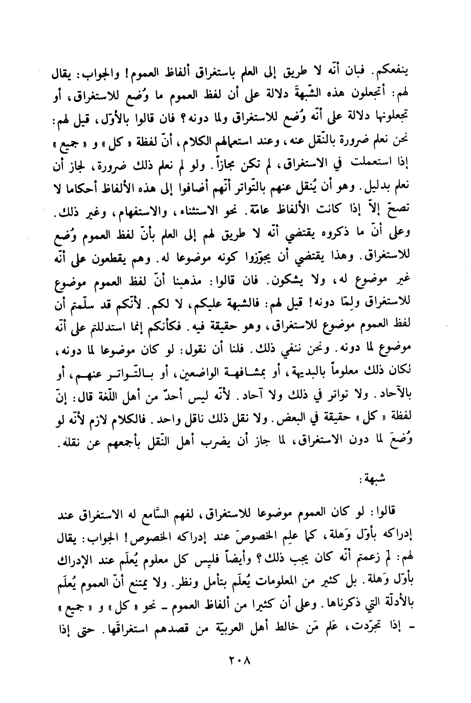 شُبْهَة قَالُوا لَو كَانَ الْعُمُوم مَوْضُوعا للاستغراق لفهم السَّامع لَهُ الِاسْتِغْرَاق عِنْد إِدْرَاكه بِأول وهلة كَمَا علم الْخُصُوص عِنْد إِدْرَاكه الْخُصُوص الْجَواب يُقَال لَهُم لم زعمتم أَنه كَانَ يجب ذَلِك وَأَيْضًا فَلَيْسَ كل مَعْلُوم يعلم عِنْد الْإِدْرَاك بِأول وهلة بل كثير من المعلومات يعلم بتأمل وَنظر وَلَا يمْتَنع أَن الْعُمُوم يعلم بالأدلة الَّتِي ذَكرنَاهَا وعَلى أَن كثيرا من أَلْفَاظ الْعُمُوم نَحْو كل وَجَمِيع