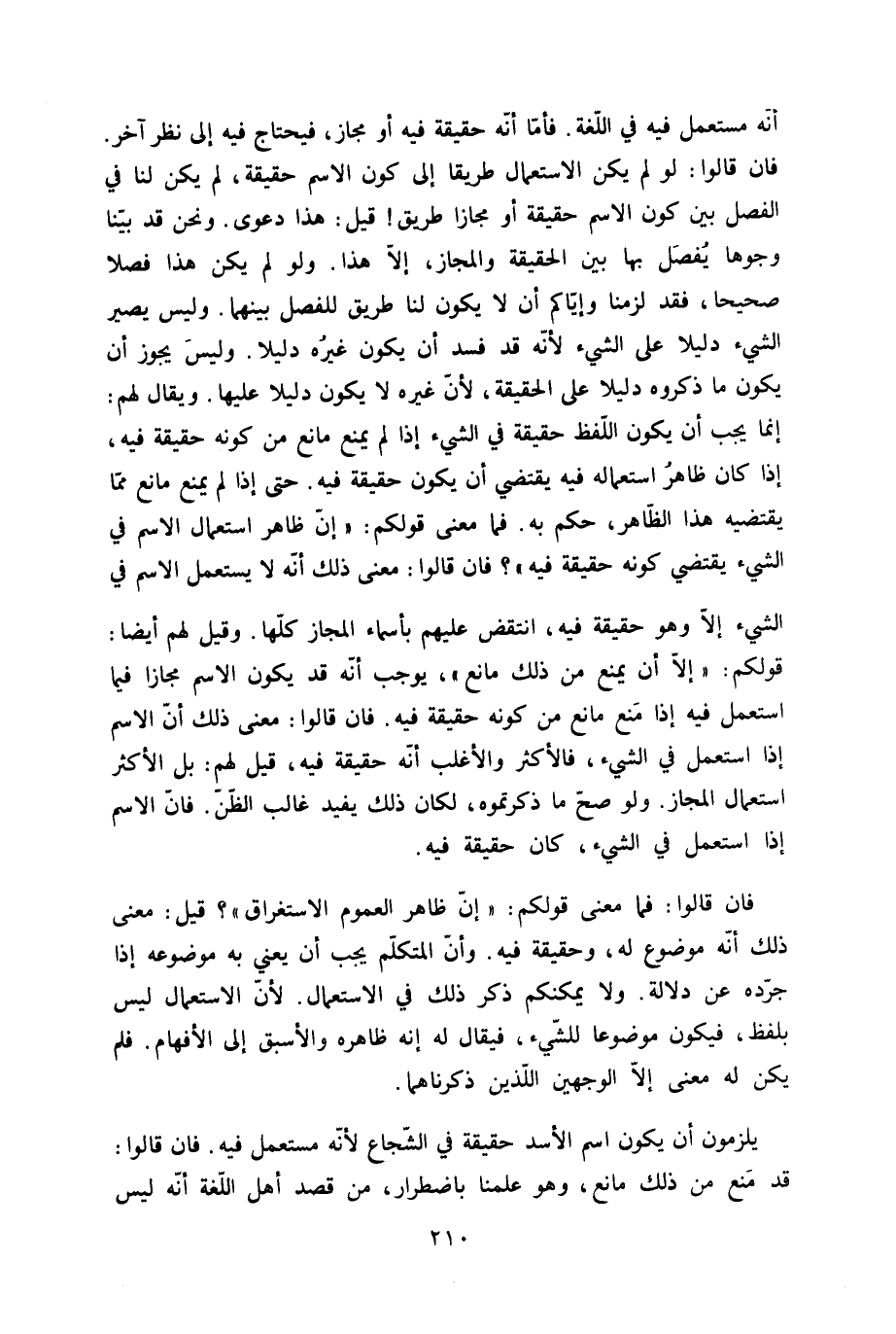فان قَالُوا لَو لم يكن الِاسْتِعْمَال طَرِيقا إِلَى كَونه الِاسْم حَقِيقَة لم يكن لنا فِي الْفَصْل بَين كَون الِاسْم حَقِيقَة أَو مجَازًا طَرِيق قيل هَذَا دَعْوَى وَنحن قد بَينا وُجُوهًا يفصل بهَا بَين الْحَقِيقَة وَالْمجَاز إِلَّا هَذَا وَلَو لم يكن هَذَا فصلا صَحِيحا فقد لزمنا وَإِيَّاكُم أَن لَا يكون لنا طَرِيق للفصل بَينهمَا وَلَيْسَ يصير الشَّيْء دَلِيلا على الشَّيْء لِأَنَّهُ قد فسد أَن يكون غَيره دَلِيلا وَلَيْسَ يجوز أَن يكون مَا ذَكرُوهُ دَلِيلا على الْحَقِيقَة لِأَن غَيره لَا يكون دَلِيلا عَلَيْهَا وَيُقَال لَهُم إِنَّمَا يجب أَن يكون اللَّفْظ حَقِيقَة فِي الشَّيْء إِذا لم يمْنَع مَانع من كَونه حَقِيقَة فِيهِ إِذا كَانَ ظَاهر اسْتِعْمَاله فِيهِ يَقْتَضِي أَن يكون حقيقه فِيهِ حَتَّى إِذا لم يمْنَع مَانع مِمَّا يَقْتَضِيهِ حكم الظَّاهِر حكم بِهِ فَمَا معنى قَوْلكُم إِن ظَاهر اسْتِعْمَال الِاسْم فِي الشَّيْء يَقْتَضِي كَونه حَقِيقَة فِيهِ فان قَالُوا معنى ذَلِك أَنه لَا يسْتَعْمل الِاسْم فِي الشَّيْء إِلَّا وَهُوَ حَقِيقَة فِيهِ انْتقض عَلَيْهِم بأسماء الْمجَاز كلهَا وَقيل لَهُم أَيْضا قَوْلكُم إِلَّا أَن يمْنَع من ذَلِك مَانع يُوجب أَنه قد يكون الِاسْم مجَازًا فِيمَا اسْتعْمل فِيهِ إِذا منع مَانع من كَونه حَقِيقَة فِيهِ فان قَالُوا معنى ذَلِك أَن الِاسْم إِذا اسْتعْمل فِي الشَّيْء فالأكثر والأغلب أَنه حَقِيقَة فِيهِ قيل لَهُم بل الْأَكْثَر اسْتِعْمَال الْمجَاز وَلَو صَحَّ مَا ذكرتموه لَكَانَ ذَلِك يُفِيد غَالب الظَّن فان الِاسْم إِذا اسْتعْمل فِي الشَّيْء كَانَ حَقِيقَة فِيهِ
