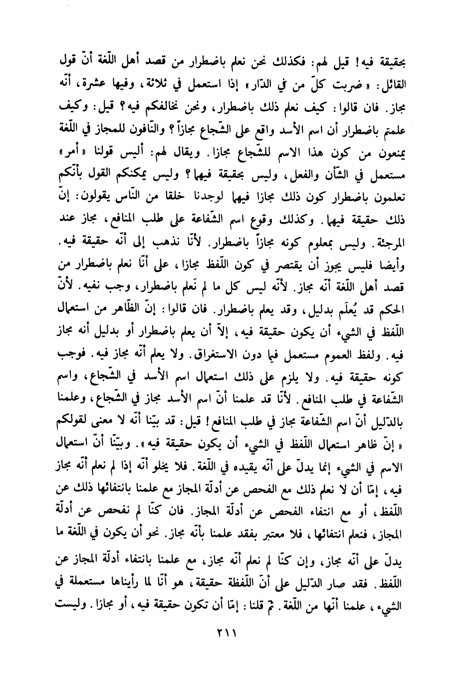 بِحَقِيقَة فِيهِ قيل لَهُم فَكَذَلِك نَحن نعلم باضطرار من قصد أهل اللُّغَة أَن قَول الْقَائِل ضربت كل من فِي الدَّار إِذا اسْتعْمل فِي ثَلَاثَة وفيهَا عشرَة أَنه مجَاز فان قَالُوا كَيفَ نعلم ذَلِك باضطرار وَنحن نخالفكم فِيهِ قيل وَكَيف علمْتُم باضطرار أَن اسْم الْأسد وَاقع على الشجاع مجَازًا والنافون للمجاز فِي اللُّغَة يمْنَعُونَ من كَون هَذَا الِاسْم للشجاع مجَازًا وَيُقَال لَهُم أَلَيْسَ قَوْلنَا أَمر مُسْتَعْمل فِي الشَّأْن وَالْفِعْل وَلَيْسَ بِحَقِيقَة فيهمَا وَلَيْسَ يمكنكم القَوْل بأنكم تعلمُونَ باضطرار كَون ذَلِك مجَازًا فيهمَا لوجدنا خلقا من النَّاس يَقُولُونَ إِن ذَلِك حَقِيقَة فيهمَا وَكَذَلِكَ وُقُوع اسْم الشَّفَاعَة على طلب الْمَنَافِع مجَاز عِنْد المرجئة وَلَيْسَ بِمَعْلُوم كَونه مجَازًا باضطرار لأَنا نَذْهَب إِلَى أَنه حَقِيقَة فِيهِ