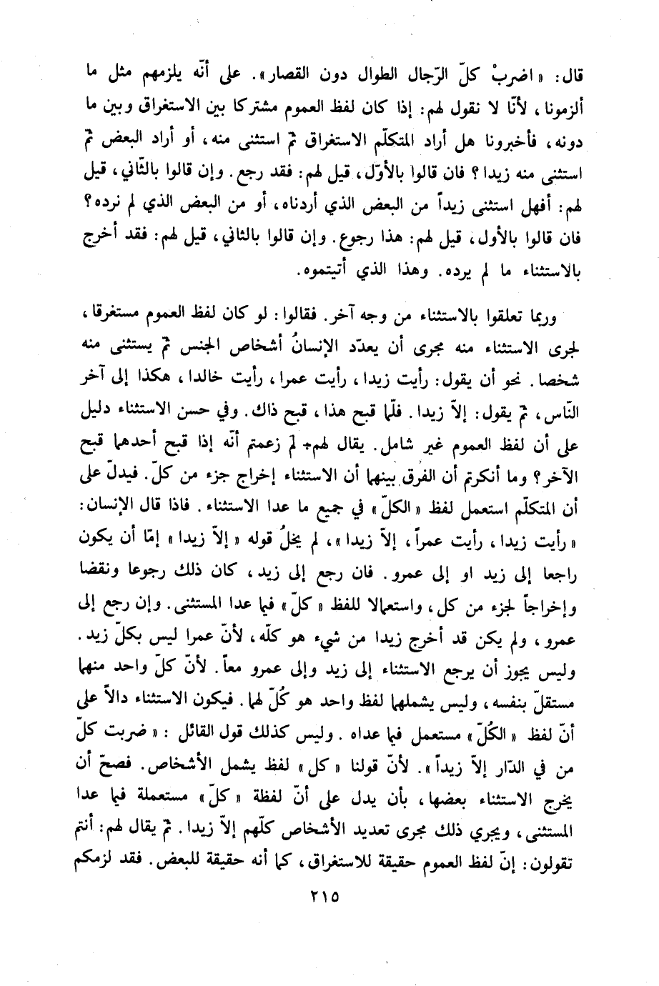 وَرُبمَا تعلقوا بِالِاسْتِثْنَاءِ من وَجه آخر فَقَالُوا لَو كَانَ لفظ الْعُمُوم مُسْتَغْرقا لجرى الِاسْتِثْنَاء مِنْهُ مجْرى أَن يعدد الْإِنْسَان أشخاص الْجِنْس ثمَّ يسْتَثْنى مِنْهُ شخصا نَحْو أَن يَقُول رَأَيْت زيدا رَأَيْت عمرا رَأَيْت خَالِدا هَكَذَا إِلَى آخر النَّاس ثمَّ يَقُول إِلَّا زيدا فَلَمَّا قبح هَذَا قبح ذَاك وَفِي حسن الِاسْتِثْنَاء دَلِيل على ان لفظ الْعُمُوم غير شَامِل يُقَال لَهُم لم زعمتم أَنه إِذا قبح أَحدهمَا قبح الآخر وَمَا أنكرتم أَن الْفرق بَينهمَا أَن الِاسْتِثْنَاء إِخْرَاج جُزْء من كل فَيدل على أَن الْمُتَكَلّم اسْتعْمل لفظ الْكل فِي جَمِيع مَا عدا الِاسْتِثْنَاء فاذا قَالَ الْإِنْسَان رَأَيْت زيدا رَأَيْت عمرا إِلَّا زيدا لم يخل قَوْله إِلَّا زيدا إِمَّا أَن يكون رَاجعا إِلَى زيد اَوْ إِلَى عَمْرو فان رَجَعَ إِلَى زيد كَانَ ذَلِك رُجُوعا ونقضا وإخراجا لجزء من كل واستعمالا للفظ كل فِيمَا عدا الْمُسْتَثْنى وَإِن رَجَعَ إِلَى عَمْرو وَلم يكن قد أخرج زيدا من شَيْء هُوَ كُله لِأَن عمرا لَيْسَ بِكُل زيد وَلَيْسَ يجوز أَن يرجع الِاسْتِثْنَاء إِلَى زيد وَإِلَى عَمْرو مَعًا لِأَن كل وَاحِد مِنْهُمَا مُسْتَقل بِنَفسِهِ وَلَيْسَ يشملهما لفظ وَاحِد هُوَ كل لَهما فَيكون الِاسْتِثْنَاء دَالا على أَن لفظ الْكل مُسْتَعْمل فِيمَا عداهُ وَلَيْسَ كَذَلِك قَول الْقَائِل ضربت كل من فِي الدَّار إِلَّا زيدا لِأَن قَوْلنَا كل لفظ يَشْمَل الْأَشْخَاص فصح أَن يخرج الِاسْتِثْنَاء بَعْضهَا بِأَن يدل على أَن لَفْظَة كل مستعملة فِيمَا عدا الْمُسْتَثْنى وَيجْرِي ذَلِك مجْرى تعديد الْأَشْخَاص كلهم إِلَّا زيدا ثمَّ يُقَال لَهُم أَنْتُم تَقولُونَ إِن لفظ الْعُمُوم حَقِيقَة للاستغراق كَمَا أَنه حَقِيقَة للْبَعْض فقد لزمكم