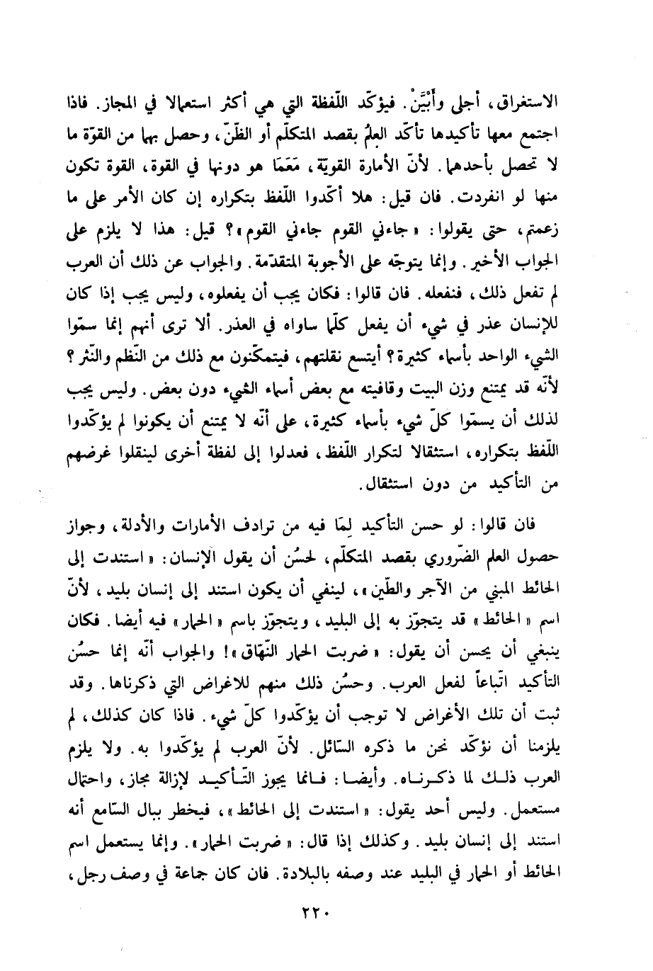 فان قَالُوا لَو حسن التَّأْكِيد لما فِيهِ من ترادف الأمارات والأدلة وَجَوَاز حُصُول الْعلم الضَّرُورِيّ بِقصد الْمُتَكَلّم لحسن أَن يَقُول الْإِنْسَان استندت إِلَى الْحَائِط الْمَبْنِيّ من الْآجر والطين لينفي أَن يكون اسْتندَ إِلَى إِنْسَان بليد لِأَن اسْم الْحَائِط قد يتجوز بِهِ إِلَى البليد ويتجوز باسم الْحمار فِيهِ أَيْضا فَكَانَ يَنْبَغِي أَن يحسن أَن يَقُول ضربت الْحمار النهاق وَالْجَوَاب أَنه إِنَّمَا حسن التَّأْكِيد اتبَاعا لفعل الْعَرَب وَحسن ذَلِك مِنْهُم للأغراض الَّتِي ذَكرنَاهَا وَقد ثَبت أَن تِلْكَ الْأَغْرَاض لَا توجب أَن يؤكدوا كل شَيْء فاذا كَانَ كَذَلِك لم يلْزمنَا أَن نؤكد نَحن مَا ذكره السَّائِل لِأَن الْعَرَب لم يؤكدوا بِهِ وَلَا يلْزم الْعَرَب ذَلِك لما ذَكرْنَاهُ وَأَيْضًا فانما يجوز التَّأْكِيد لإِزَالَة مجَاز وَاحْتِمَال مُسْتَعْمل وَلَيْسَ أحد يَقُول استندت إِلَى الْحَائِط فيخطر ببال السَّامع أَنه اسْتندَ إِلَى إِنْسَان بليد وَكَذَلِكَ إِذا قَالَ ضربت الْحمار وَإِنَّمَا يسْتَعْمل اسْم الْحَائِط أَو الْحمار فِي البليد عِنْد وَصفه بالبلادة فان كَانَ جمَاعَة فِي وصف رجل