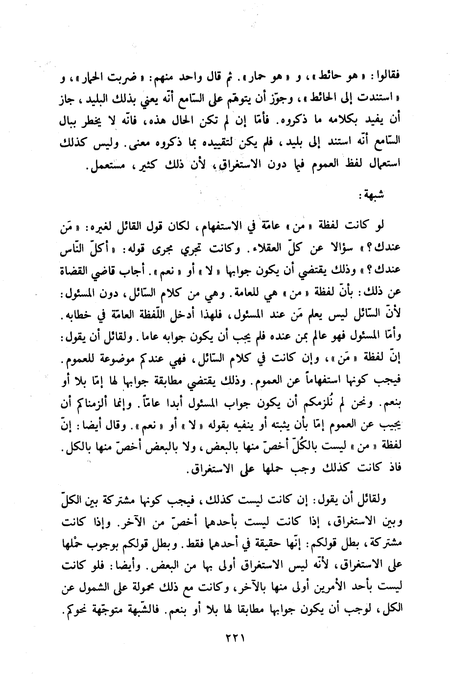 وَلقَائِل أَن يَقُول إِن كَانَت لَيست كَذَلِك فَيجب كَونهَا مُشْتَركَة بَين الْكل وَبَين الِاسْتِغْرَاق إِذا كَانَت لَيست بِأَحَدِهِمَا أخص من الآخر وَإِذا كَانَت مُشْتَركَة بَطل قَوْلكُم إِنَّهَا حَقِيقَة فِي أَحدهمَا فَقَط وَبَطل قَوْلكُم بِوُجُوب حملهَا على الِاسْتِغْرَاق لِأَنَّهُ لَيْسَ الِاسْتِغْرَاق أولى بهَا من الْبَعْض وَأَيْضًا فَلَو كَانَت لَيست بِأحد الْأَمريْنِ أولى مِنْهَا بِالْآخرِ وَكَانَت مَعَ ذَلِك مَحْمُولَة على الشُّمُول عَن الْكل لوَجَبَ أَن يكون جوابها مطابقا لَهَا بِلَا أَو بنعم فالشبهة متوجهة نحوكم