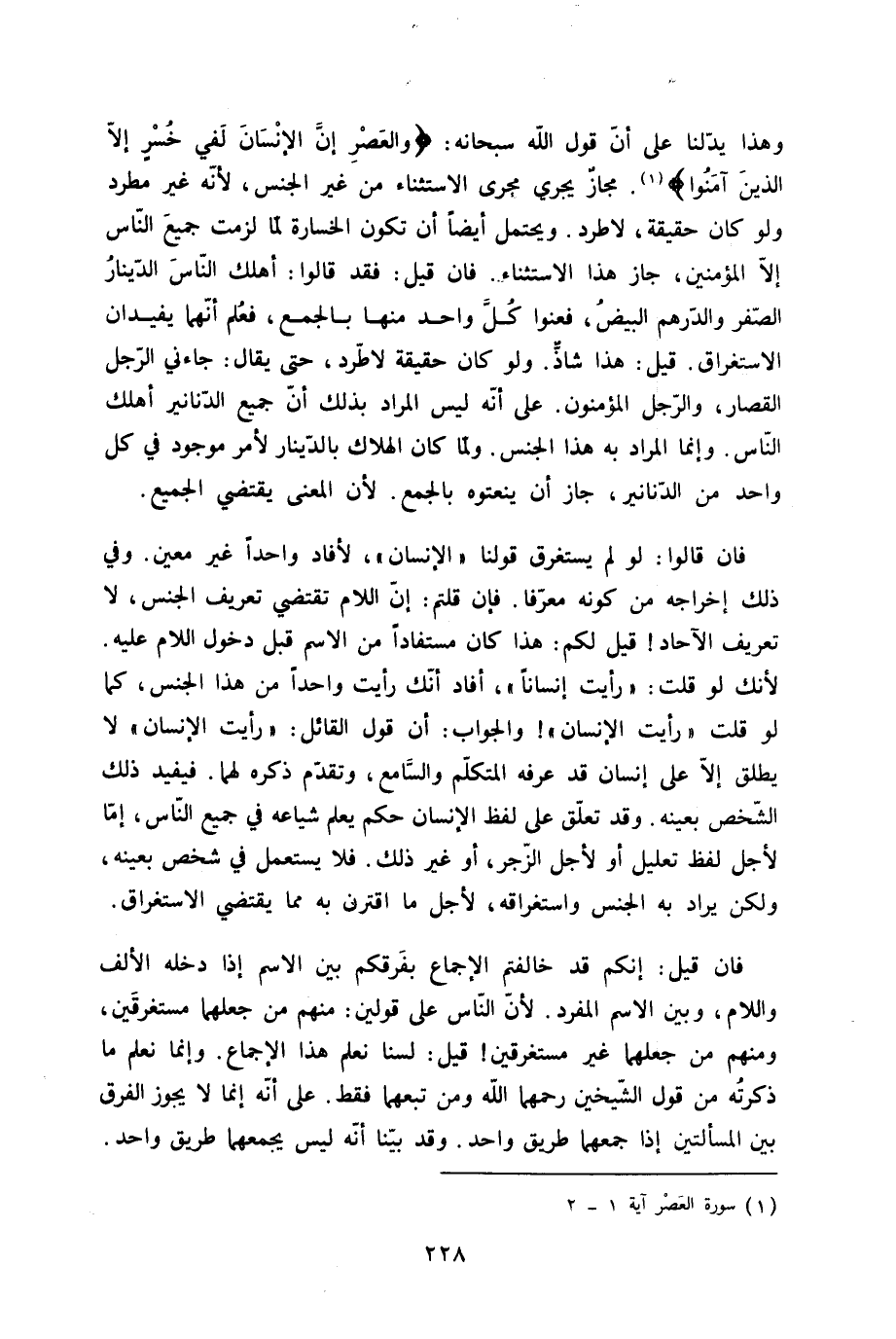 وَهَذَا يدلنا على أَن قَول الله سُبْحَانَهُ {وَالْعصر إِن الْإِنْسَان لفي خسر إِلَّا الَّذين آمنُوا} مجَاز يجْرِي مجْرى الِاسْتِثْنَاء من غير الْجِنْس لِأَنَّهُ غير مطرد وَلَو كَانَ حَقِيقَة لاطرد وَيحْتَمل أَيْضا أَن تكون الخسارة لما لَزِمت جَمِيع النَّاس إِلَّا الْمُؤمنِينَ جَازَ هَذَا الِاسْتِثْنَاء فان قيل فقد قَالُوا أهلك النَّاس الدِّينَار الصفر وَالدِّرْهَم الْبيض فعنوا كل وَاحِد مِنْهَا بِالْجمعِ فَعلم أَنَّهُمَا يفيدان الِاسْتِغْرَاق قيل هَذَا شَاذ وَلَو كَانَ حَقِيقَة لاطرد حَتَّى يُقَال جَاءَنِي الرجل الْقصار وَالرجل الْمُؤْمِنُونَ على أَنه لَيْسَ المُرَاد بذلك أَن جَمِيع الدَّنَانِير أهلك النَّاس وَإِنَّمَا المُرَاد بِهِ هَذَا الْجِنْس وَلما كَانَ الْهَلَاك بالدينار لأمر مَوْجُود فِي كل وَاحِد من الدَّنَانِير جَازَ أَن ينعتوه بِالْجمعِ لِأَن الْمَعْنى يَقْتَضِي الْجَمِيع