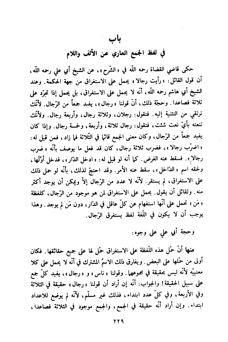 حكى قَاضِي الْقُضَاة رَحمَه الله فِي الشَّرْح عَن الشَّيْخ أبي عَليّ رَحمَه الله ان قَول الْقَائِل رَأَيْت رجَالًا يحمل على الِاسْتِغْرَاق من جِهَة الْحِكْمَة وَعند الشَّيْخ أبي هَاشم رَحمَه الله أَنه لَا يحمل على الِاسْتِغْرَاق بل يحمل إِذا تجرد على ثَلَاثَة فَصَاعِدا وَحجَّة ذَلِك أَن قَوْلنَا رجال يُفِيد جمعا من الرِّجَال لِأَنَّك ترتقي من التَّثْنِيَة إِلَيْهِ فَتَقول رجلَانِ وَثَلَاثَة رجال وَأَرْبَعَة رجال ولأنك تنعته بِأَيّ نعت شِئْت فَتَقول رجال ثَلَاثَة وَأَرْبَعَة وَخَمْسَة رجال وَإِذا كَانَ يُفِيد جمعا من الرِّجَال وَكَانَ معنى الْجمع قَائِما فِي الثَّلَاثَة فَمَا زَاد فَمن قيل لَهُ اضْرِب رجَالًا فَضرب ثَلَاثَة رجال كَانَ قد فعل مَا يُوصف بِأَنَّهُ ضرب رجال فَسقط عَنهُ الْغَرَض كَمَا أَنه لوقيل لَهُ ادخل الدَّار فَدخل أَولهَا ولحقه اسْم الدَّاخِل سقط عَنهُ الْأَمر وَقد احْتج لذَلِك بِأَنَّهُ لَو حمل ذَلِك على الِاسْتِغْرَاق لم يسْتَقرّ لِأَنَّهُ لَا عدد من الرِّجَال إِلَّا وَيُمكن أَن يُوجد أَكثر مِنْهُ وَلقَائِل أَن يَقُول يحمل على الِاسْتِغْرَاق لمن هُوَ مَوْجُود من الرِّجَال كلفظة من تحمل على أَنَّهَا اسْتِفْهَام عَن كل عَاقل فِي الدَّار دون من لم يُوجد وَهَذَا يُوجب أَن لَا يكون فِي اللُّغَة لفظ يسْتَغْرق الرِّجَال