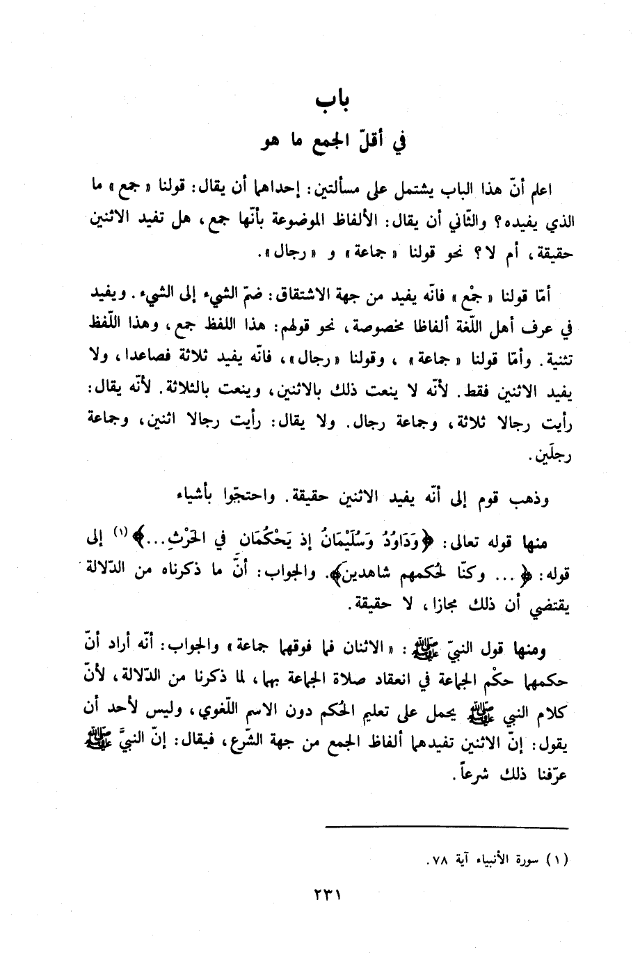 اعْلَم أَن هَذَا الْبَاب يشْتَمل على مَسْأَلَتَيْنِ إِحْدَاهمَا أَن يُقَال قَوْلنَا جمع مَا الَّذِي يفِيدهُ وَالثَّانِي أَن يُقَال الْأَلْفَاظ الْمَوْضُوعَة بِأَنَّهَا جمع هَل تفِيد الِاثْنَيْنِ حَقِيقَة أم لَا نَحْو قَوْلنَا جمَاعَة وَرِجَال