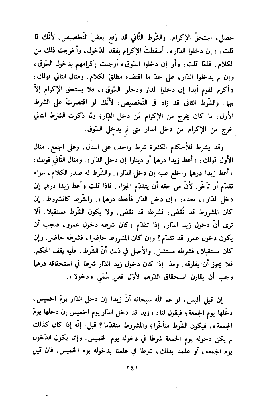 حصل اسْتحق الْإِكْرَام وَالشّرط الثَّانِي قد رفع بعض التَّخْصِيص لِأَنَّك لما قلت إِن دخلُوا الدَّار أسقطت الْإِكْرَام بفقد الدُّخُول وأخرجت ذَلِك من الْكَلَام فَلَمَّا قلت أَو إِن دخلُوا السُّوق أوجبت إكرامهم بِدُخُول السُّوق وَإِن لم يدخلُوا الدَّار على حد مَا اقْتَضَاهُ مُطلق الْكَلَام وَمِثَال الثَّانِي قَوْلك أكْرم الْقَوْم أبدا إِن دخلُوا الدَّار ودخلوا السُّوق فَلَا يسْتَحق الْإِكْرَام إِلَّا بهما وَالشّرط الثَّانِي قد زَاد فِي التَّخْصِيص لِأَنَّك لَو اقتصرت على الشَّرْط الأول مَا كَانَ يخرج من الْإِكْرَام من دخل الدَّار وَلما ذكرت الشَّرْط الثَّانِي خرج من الْإِكْرَام من دخل الدَّار مَتى لم يدْخل السُّوق