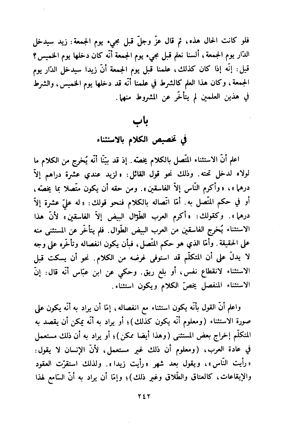 فَلَو كَانَت الْحَال هَذِه ثمَّ قَالَ عز وَجل قبل مَجِيء يَوْم الْجُمُعَة زيد سيدخل الدَّار يَوْم الْجُمُعَة أَلسنا نعلم قبل مَجِيء يَوْم الْجُمُعَة أَنه كَانَ دَخلهَا يَوْم الْخَمِيس قيل إِنَّه إِذا كَانَ كَذَلِك علمنَا قبل يَوْم الْجُمُعَة أَن زيدا سيدخل الدَّار يَوْم الْجُمُعَة وَكَانَ هَذَا الْعلم كالشرط فِي علمنَا أَنه قد دَخلهَا يَوْم الْخَمِيس وَالشّرط فِي هذَيْن العلمين لم يتَأَخَّر عَن الْمَشْرُوط مِنْهُمَا - صَلَّى اللَّهُ عَلَيْهِ وَسَلَّم َ - بَاب فِي تَخْصِيص الْكَلَام بِالِاسْتِثْنَاءِ - صَلَّى اللَّهُ عَلَيْهِ وَسَلَّم َ -