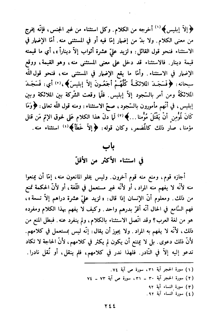 {إِلَّا إِبْلِيس} أخرجه من الْكَلَام وكل اسْتثِْنَاء من غير الْجِنْس فَإِنَّهُ يخرج من معنى الْكَلَام وَلَا بُد من إِضْمَار إِمَّا فِيهِ أَو فِي الْمُسْتَثْنى مِنْهُ أما الْإِضْمَار فِي الِاسْتِثْنَاء فنحو قَول الْقَائِل لزيد على عشرَة أَثوَاب إِلَّا دِينَارا أَي مَا قِيمَته قيمَة دِينَار فالاستثناء قد دخل على معنى الْمُسْتَثْنى مِنْهُ وَهُوَ الْقيمَة وَوَقع الْإِضْمَار فِي الِاسْتِثْنَاء وَأما مَا يَقع الْإِضْمَار فِي الْمُسْتَثْنى مِنْهُ فنحو قَول الله سُبْحَانَهُ {فَسجدَ الْمَلَائِكَة كلهم أَجْمَعُونَ إِلَّا إِبْلِيس} أَي فَسجدَ الْمَلَائِكَة وَمن أَمر بِالسُّجُود إِلَّا إِبْلِيس فَلَمَّا وَقعت الشّركَة بَين الْمَلَائِكَة وَبَين إِبْلِيس فِي أَنهم مأمورون بِالسُّجُود صَحَّ الِاسْتِثْنَاء وَمِنْه قَول الله تَعَالَى {وَمَا كَانَ لمُؤْمِن أَن يقتل مُؤمنا} لما دلّ هَذَا الْكَلَام على لُحُوق الْإِثْم من قتل مُؤمنا صَار ذَلِك كالمضمر وَكَانَ قَوْله {إِلَّا خطأ} اسْتثِْنَاء مِنْهُ - صَلَّى اللَّهُ عَلَيْهِ وَسَلَّم َ - بَاب فِي اسْتثِْنَاء الْأَكْثَر من الْأَقَل - صَلَّى اللَّهُ عَلَيْهِ وَسَلَّم َ -