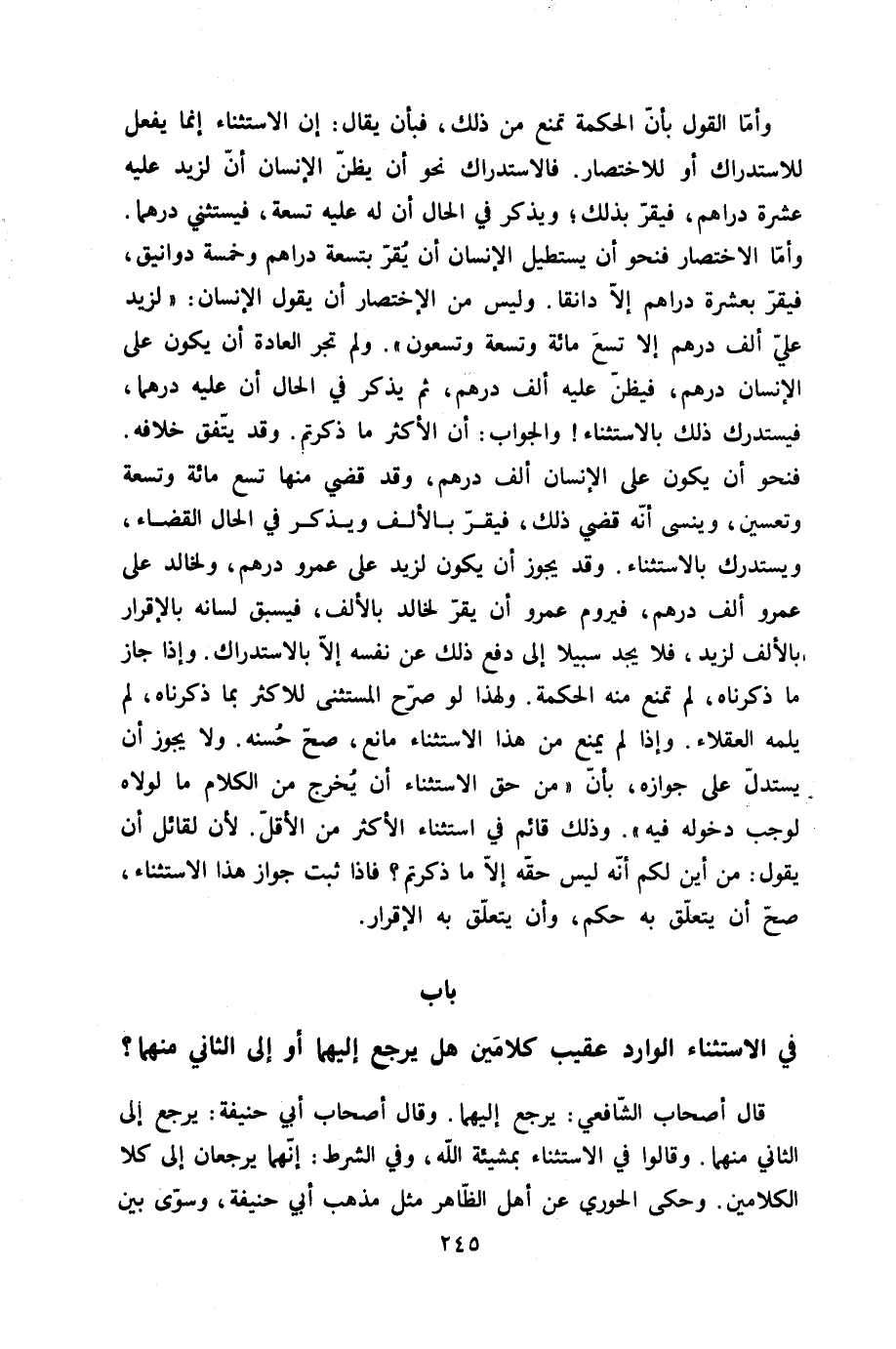 وَأما القَوْل بِأَن الْحِكْمَة تمنع من ذَلِك فبأن يُقَال إِن الِاسْتِثْنَاء إِنَّمَا يفعل للاستدراك أَو للاختصار فالاستدراك نَحْو أَن يظنّ الْإِنْسَان أَن لزيد عَلَيْهِ عشرَة دَرَاهِم فَيقر بذلك وَيذكر فِي الْحَال أَن لَهُ عَلَيْهِ تِسْعَة فَيَسْتَثْنِي درهما وَأما الِاخْتِصَار فنحو أَن يستطيل الْإِنْسَان أَن يقر بِتِسْعَة دَرَاهِم وَخَمْسَة دوانيق فَيقر بِعشْرَة دَرَاهِم إِلَّا دانقا وَلَيْسَ من الِاخْتِصَار أَن يَقُول الْإِنْسَان لزيد عَليّ ألف دِرْهَم إِلَّا تسع مائَة وَتِسْعَة وَتسْعُونَ وَلم تجر الْعَادة أَن يكون على الْإِنْسَان دِرْهَم فيظن عَلَيْهِ ألف دِرْهَم ثمَّ يذكر فِي الْحَال أَن عَلَيْهِ درهما فيستدرك ذَلِك بِالِاسْتِثْنَاءِ وَالْجَوَاب أَن الْأَكْثَر مَا ذكرْتُمْ وَقد يتَّفق خِلَافه فنحو أَن يكون على الْإِنْسَان ألف دِرْهَم وَقد قضي مِنْهَا تسع مائَة وَتِسْعَة وَتِسْعين وينسى أَنه قضي ذَلِك فَيقر بِالْألف وَيذكر فِي الْحَال الْقَضَاء ويستدرك بِالِاسْتِثْنَاءِ وَقد يجوز أَن يكون لزيد على عَمْرو دِرْهَم ولخالد على عَمْرو ألف دِرْهَم فيروم عَمْرو أَن يقر لخَالِد بِالْألف فَيَسْبق لِسَانه بِالْإِقْرَارِ بِالْألف لزيد فَلَا يجد سَبِيلا إِلَى دفع ذَلِك عَن نَفسه إِلَّا بالاستدراك وَإِذا جَازَ مَا ذَكرْنَاهُ لم تمنع مِنْهُ الْحِكْمَة وَلِهَذَا لَو صرح الْمُسْتَثْنى للاكثر بِمَا ذَكرْنَاهُ لم يلمه الْعُقَلَاء وَإِذا لم يمْنَع من هَذَا الِاسْتِثْنَاء مَانع صَحَّ حسنه وَلَا يجوز أَن يسْتَدلّ على جَوَازه بِأَن من حق الِاسْتِثْنَاء أَن يخرج من الْكَلَام مَا لولاه لوَجَبَ دُخُوله فِيهِ وَذَلِكَ قَائِم فِي اسْتثِْنَاء الْأَكْثَر من الْأَقَل لِأَن لقَائِل أَن يَقُول من أَيْن لكم أَنه لَيْسَ حَقه إِلَّا مَا ذكرْتُمْ فاذا ثَبت جَوَاز هَذَا الِاسْتِثْنَاء صَحَّ أَن يتَعَلَّق بِهِ حكم وَأَن يتَعَلَّق بِهِ الْإِقْرَار - صَلَّى اللَّهُ عَلَيْهِ وَسَلَّم َ - بَاب فِي الِاسْتِثْنَاء الْوَارِد عقيب كلامين هَل يرجع إِلَيْهِمَا أَو إِلَى الثَّانِي مِنْهُمَا - صَلَّى اللَّهُ عَلَيْهِ وَسَلَّم َ -
