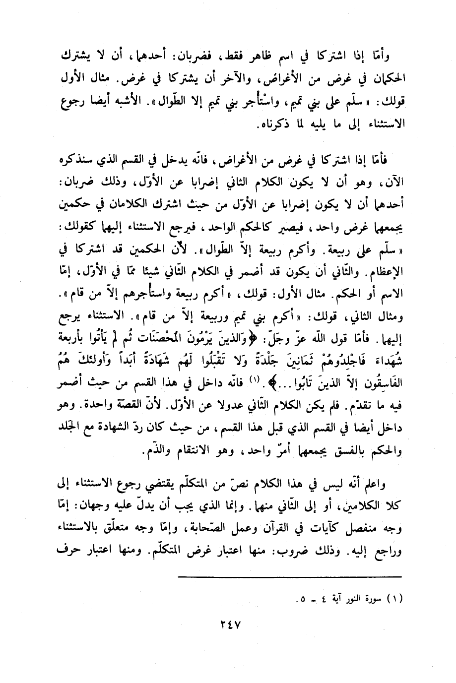 فَأَما إِذا اشْتَركَا فِي غَرَض من الْأَغْرَاض فانه يدْخل فِي الْقسم الَّذِي سَنذكرُهُ الْآن وَهُوَ أَن لَا يكون الْكَلَام الثَّانِي إضرابا عَن الأول وَذَلِكَ ضَرْبَان أَحدهمَا أَن لَا يكون إضرابا عَن الأول من حَيْثُ اشْترك الكلامان فِي حكمين يجمعهما غَرَض وَاحِد فَيصير كَالْحكمِ الْوَاحِد فَيرجع الِاسْتِثْنَاء إِلَيْهِمَا كَقَوْلِك سلم على ربيعَة وَأكْرم ربيعَة إِلَّا الطوَال لِأَن الْحكمَيْنِ قد اشْتَركَا فِي الإعظام وَالثَّانِي أَن يكون قد أضمر فِي الْكَلَام الثَّانِي شَيْئا مِمَّا فِي الأول إِمَّا الِاسْم أَو الحكم مِثَال الأول قَوْلك أكْرم ربيعَة واستأجرهم إِلَّا من قَامَ وَمِثَال الثَّانِي قَوْلك أكْرم بني تَمِيم وَرَبِيعَة إِلَّا من قَامَ الِاسْتِثْنَاء يرجع إِلَيْهِمَا فَأَما قَول الله عز وَجل {وَالَّذين يرْمونَ الْمُحْصنَات ثمَّ لم يَأْتُوا بأَرْبعَة شُهَدَاء فَاجْلِدُوهُمْ ثَمَانِينَ جلدَة وَلَا تقبلُوا لَهُم شَهَادَة أبدا وَأُولَئِكَ هم الْفَاسِقُونَ إِلَّا الَّذين تَابُوا} فانه دَاخل فِي هَذَا الْقسم من حَيْثُ أضمر فِيهِ مَا تقدم فَلم يكن الْكَلَام الثَّانِي عُدُولًا عَن الأول لِأَن الْقِصَّة وَاحِدَة وَهُوَ دَاخل أَيْضا فِي الْقسم الَّذِي قبل هَذَا الْقسم من حَيْثُ كَانَ رد الشَّهَادَة مَعَ الْجلد وَالْحكم بِالْفِسْقِ يجمعهما أَمر وَاحِد وَهُوَ الانتقام والذم