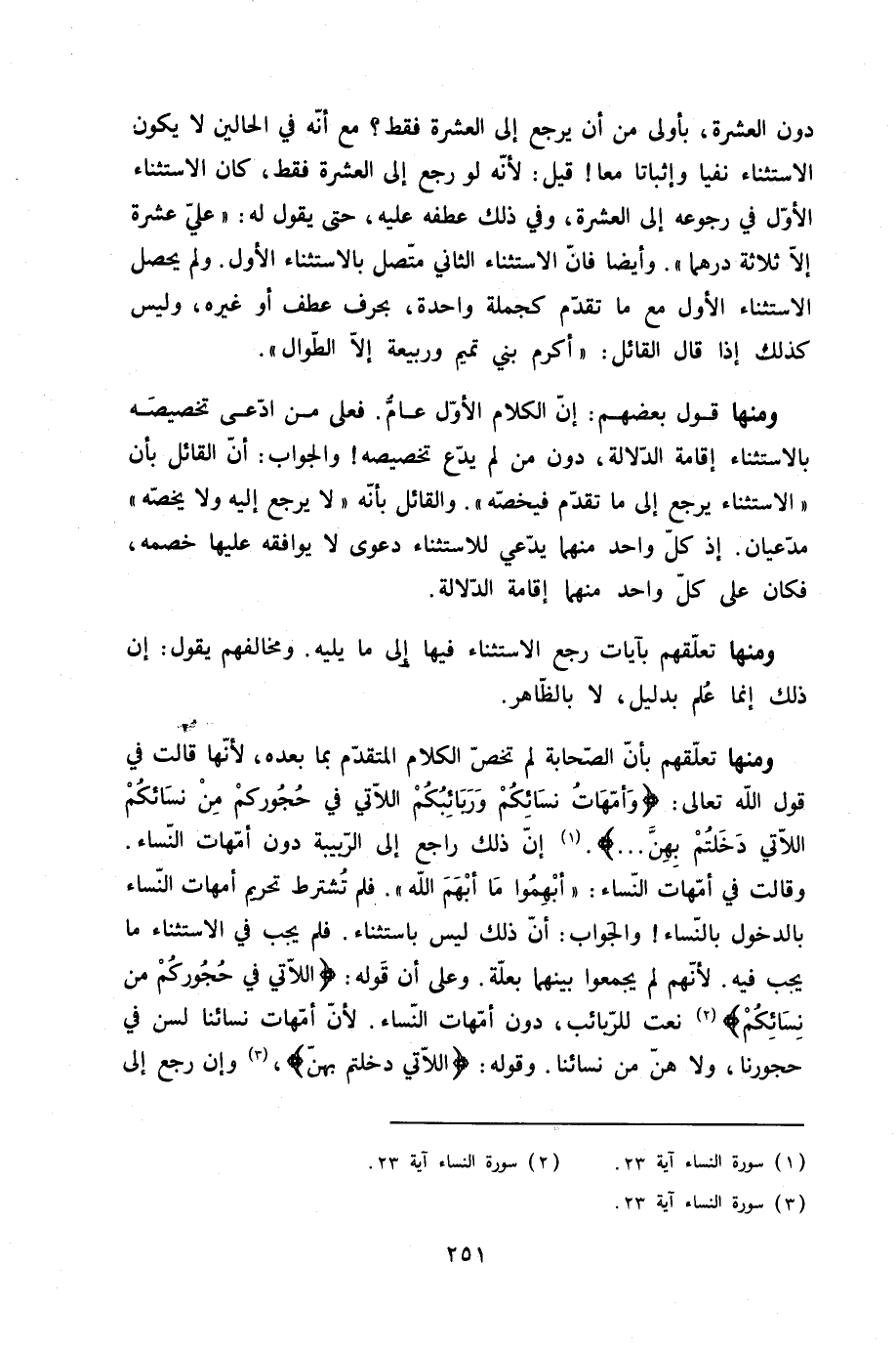 وَمِنْهَا تعلقهم بِأَن الصَّحَابَة لم تخص الْكَلَام الْمُتَقَدّم بِمَا بعده لِأَنَّهَا قَالَت فِي قَول الله تَعَالَى {وَأُمَّهَات نِسَائِكُم وربائبكم اللَّاتِي فِي حجوركم من نِسَائِكُم اللَّاتِي دَخَلْتُم بِهن} إِن ذَلِك رَاجع إِلَى الربيبة دون أُمَّهَات النِّسَاء وَقَالَت فِي أُمَّهَات النِّسَاء أبهموا مَا أبهم الله فَلم تشْتَرط تَحْرِيم أُمَّهَات النِّسَاء بِالدُّخُولِ بِالنسَاء وَالْجَوَاب أَن ذَلِك لَيْسَ باستثناء فَلم يجب فِي الِاسْتِثْنَاء مَا يجب فِيهِ لأَنهم لم يجمعوا بَينهمَا بعلة وعَلى أَن قَوْله {اللَّاتِي فِي حجوركم من نِسَائِكُم} نعت للربائب دون أُمَّهَات النِّسَاء لِأَن أُمَّهَات نسائنا لسن فِي حجورنا وَلَا هن من نسائنا وَقَوله {اللَّاتِي دَخَلْتُم بِهن} وَإِن رَجَعَ إِلَى