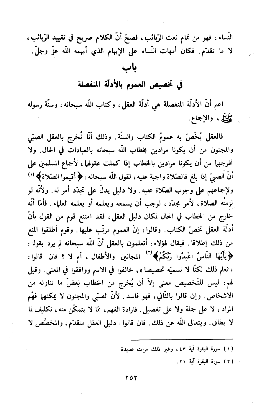 فالعقل يخص بِهِ عُمُوم الْكتاب وَالسّنة وَذَلِكَ أَنا نخرج بِالْعقلِ الصَّبِي وَالْمَجْنُون من أَن يَكُونَا مرادين بخطاب الله سُبْحَانَهُ بالعبادات فِي الْحَال وَلَا نخرجهما من أَن يَكُونَا مرادين بِالْخِطَابِ إِذا كملت عقولهما لأجماع الْمُسلمين على أَن الصَّبِي إِذا بلغ فَالصَّلَاة وَاجِبَة عَلَيْهِ لقَوْل الله سُبْحَانَهُ {أقِيمُوا الصَّلَاة} ولإجماعهم على وجوب الصَّلَاة عَلَيْهِ وَلَا دَلِيل يدل على تجدّد أَمر لَهُ وَلِأَنَّهُ لَو لَزِمته الصَّلَاة لأمر مُجَدد لوَجَبَ أَن يسمعهُ ويعلمه أَو يُعلمهُ الْعلمَاء فَأَما أَنه خَارج من الْخطاب فِي الْحَال لمَكَان دَلِيل الْعقل فقد امْتنع قوم من القَوْل بِأَن أَدِلَّة الْعقل تخص الْكتاب وَقَالُوا إِن الْعُمُوم مُرَتّب عَلَيْهَا وقم أطْلقُوا الْمَنْع من ذَلِك إطلاقا فَيُقَال لهَؤُلَاء أتعلمون بِالْعقلِ أَن الله سُبْحَانَهُ لم يرد بقوله {يَا أَيهَا النَّاس اعبدوا ربكُم} المجانين والأطفال أم لَا فان قَالُوا نعلم ذَلِك لَكنا لَا نُسَمِّيه تَخْصِيصًا خالفوا فِي الِاسْم ووافقوا فِي الْمَعْنى وَقيل لَهُم لَيْسَ للتخصيص معنى إِلَّا أَن يخرج من الْخطاب بعض مَا تنَاوله من الْأَشْخَاص وَإِن قَالُوا بِالثَّانِي فَهُوَ فَاسد لِأَن الصَّبِي وَالْمَجْنُون لَا يمكنهما فهم المُرَاد لَا على جملَة وَلَا على تَفْصِيل فارادة الْفَهم مِمَّا لَا يتَمَكَّن مِنْهُ تَكْلِيف لما لَا يُطَاق ويتعالى الله عَن ذَلِك فان قَالُوا دَلِيل الْعقل مُتَقَدم والمخصص لَا